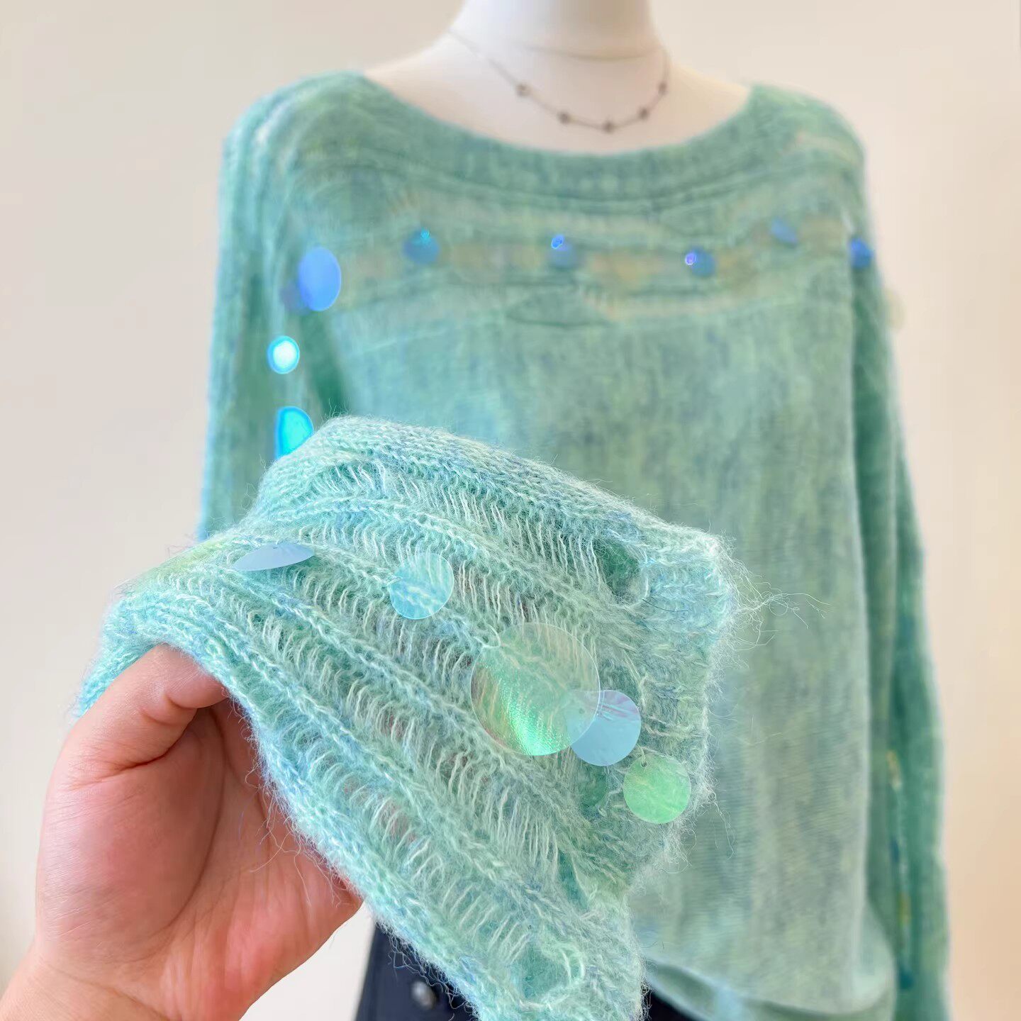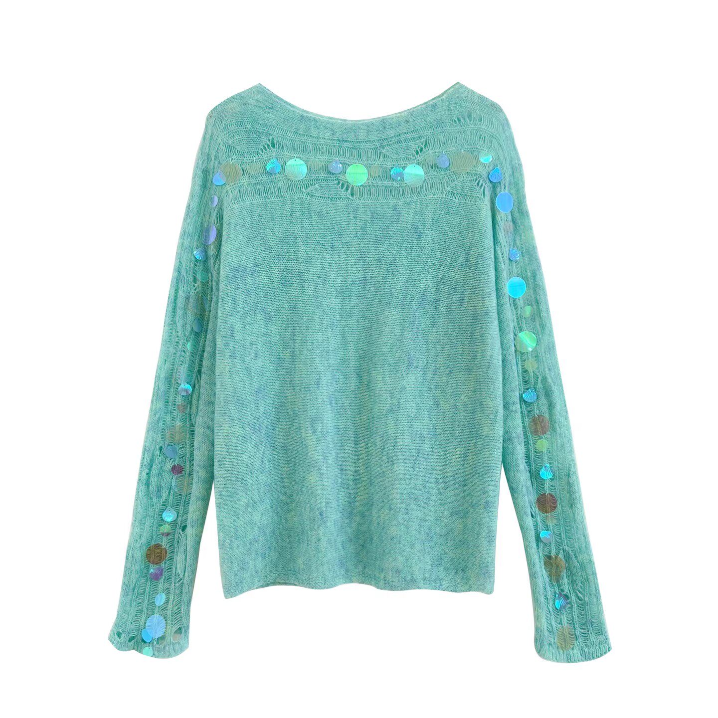推荐 软糯长袖 氛围感绿色镂空亮片长袖 女春季 上衣 针织衫 自留爆款