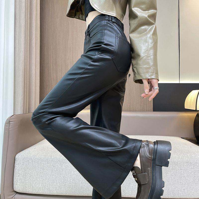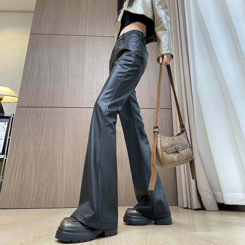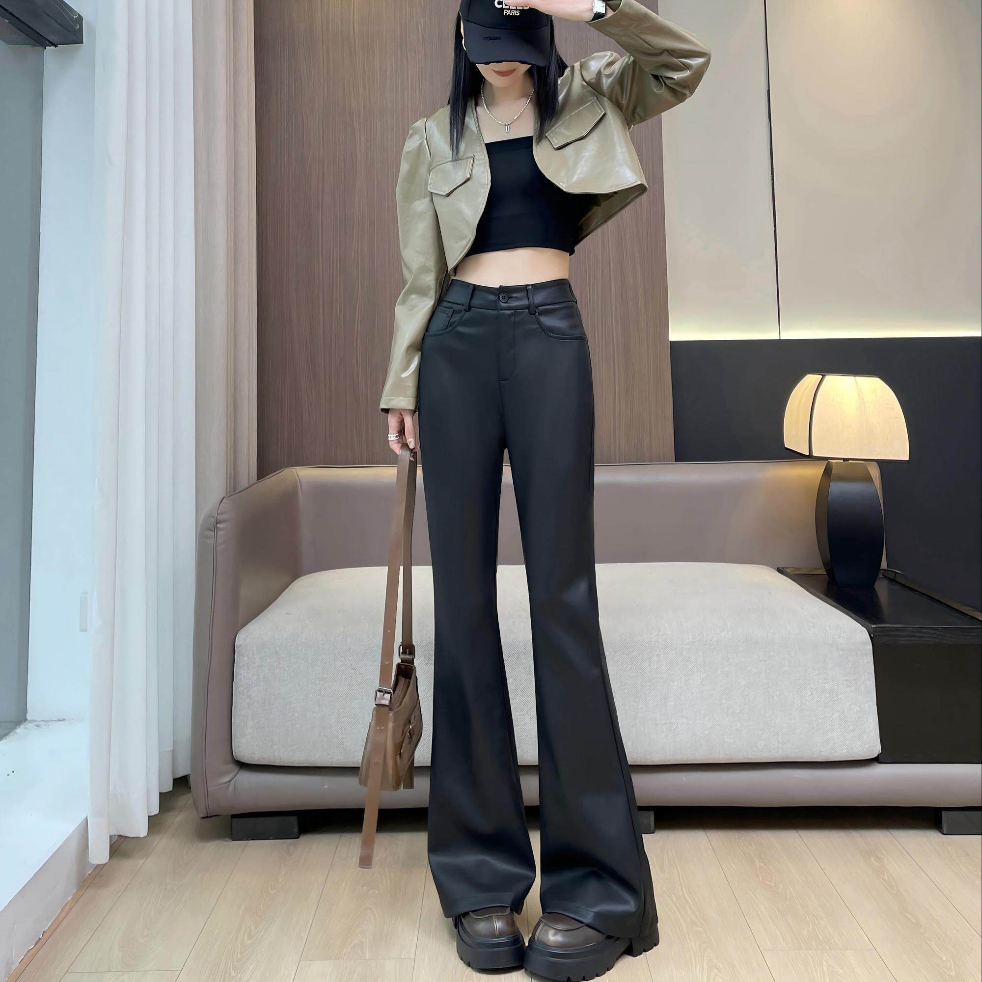 马蹄喇叭裤 春夏薄绒高腰显瘦小个子修身 女2026新款 黑色微喇皮裤