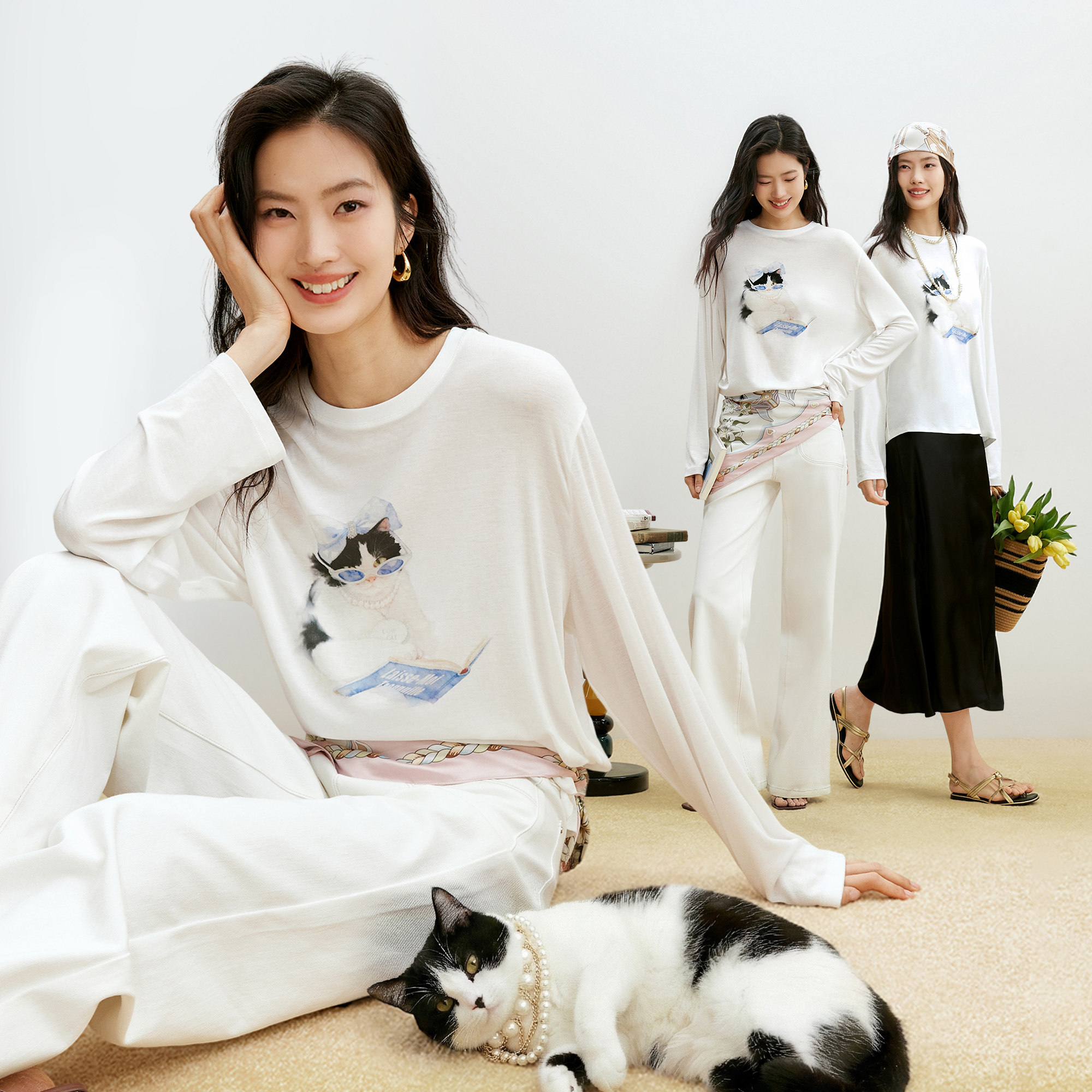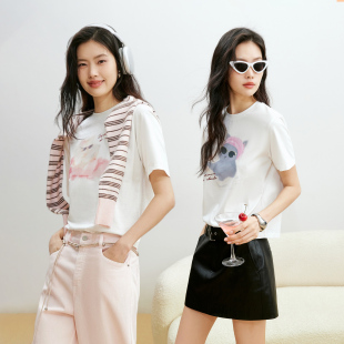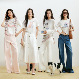 可爱猫咪印花罩衫 VeroModaT恤女26夏季 休闲圆领短袖 喵了个咪