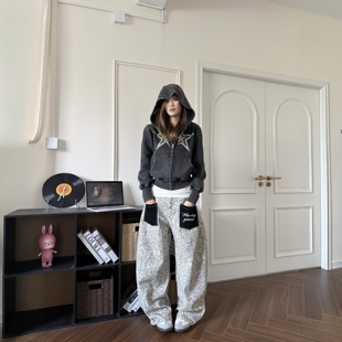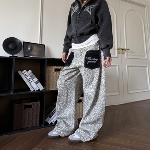 男女宽松街头阔腿弯刀休闲长裤 DHSS美式 复古豹纹贴布口袋牛仔裤