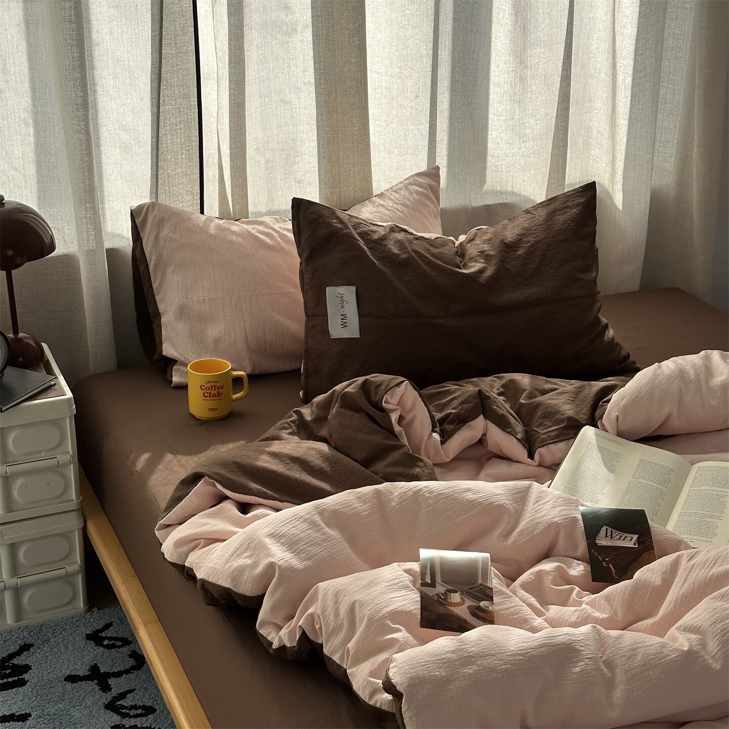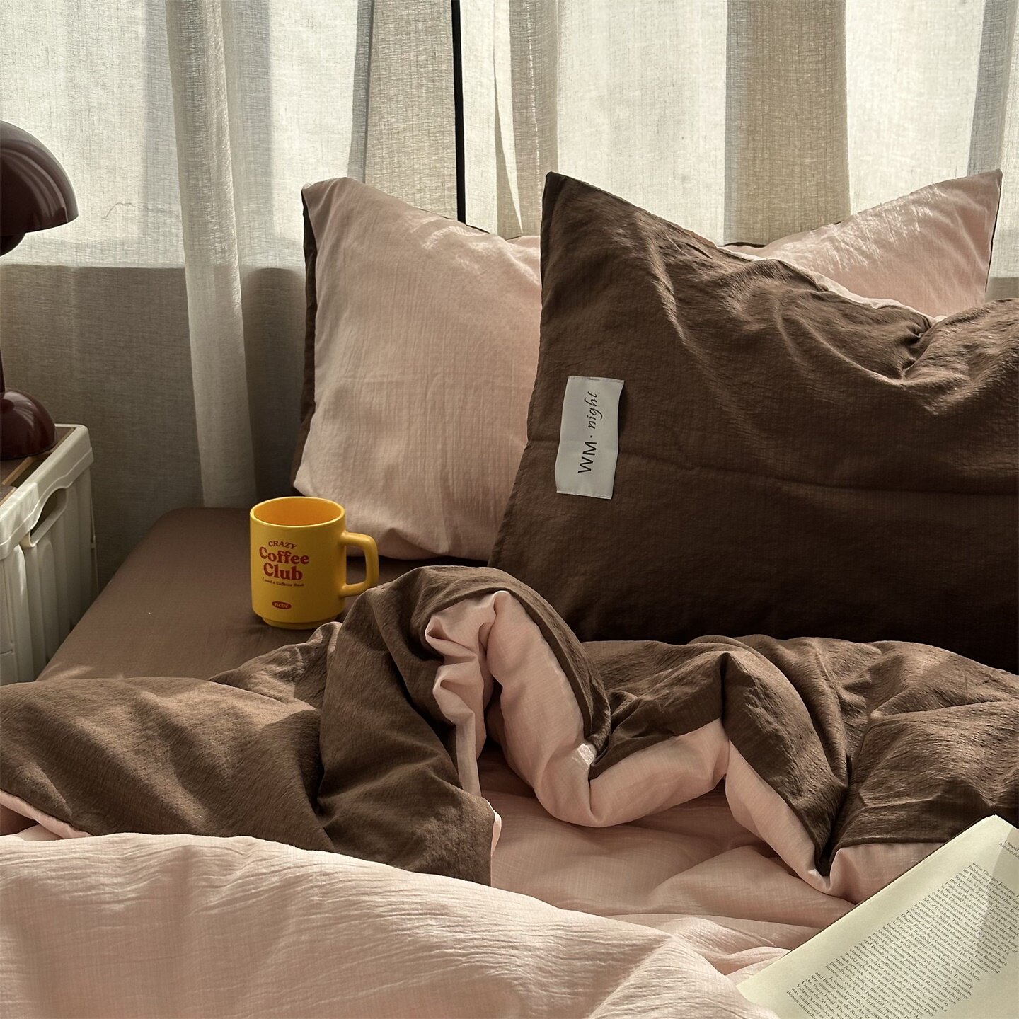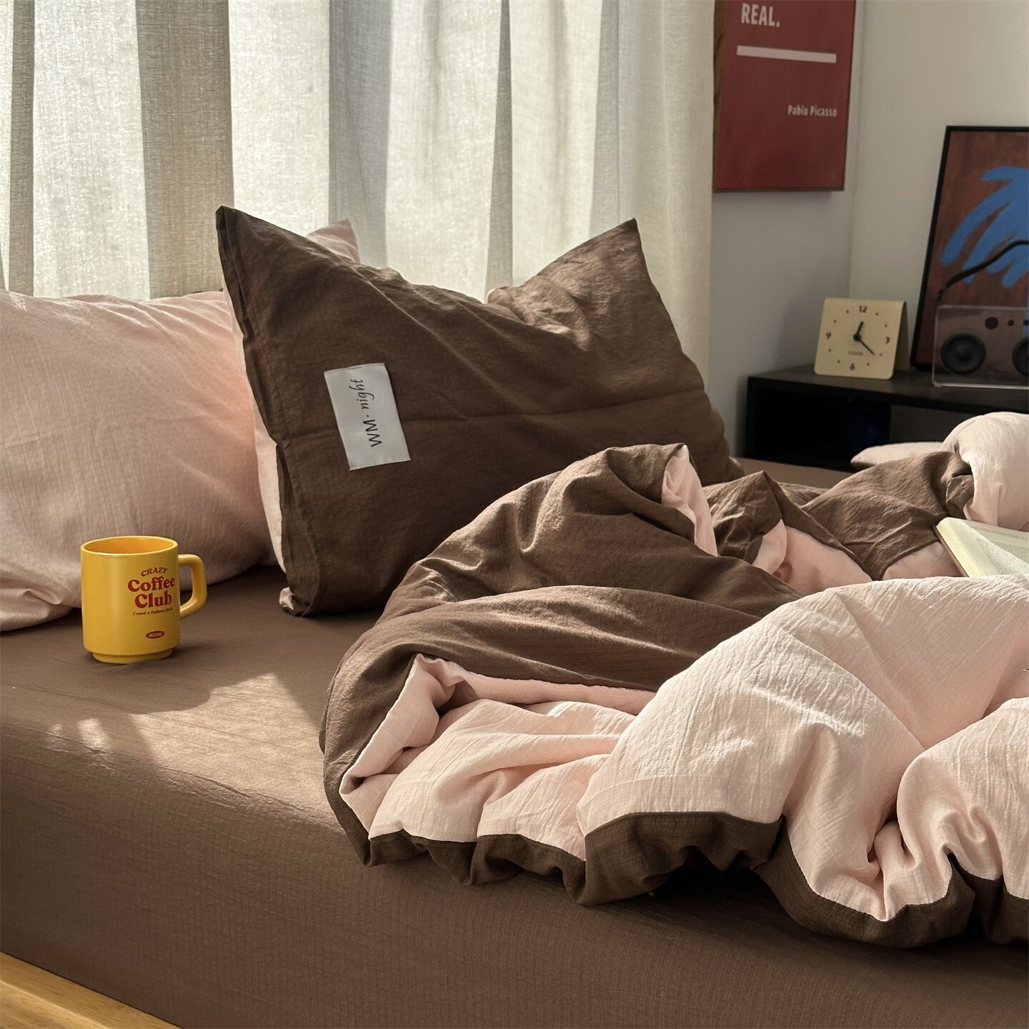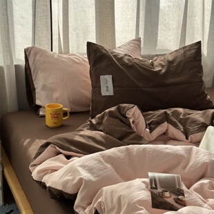 慵懒文艺ins少女粉拼棕咖水洗棉四件套床单学生宿舍三件套床笠1.8