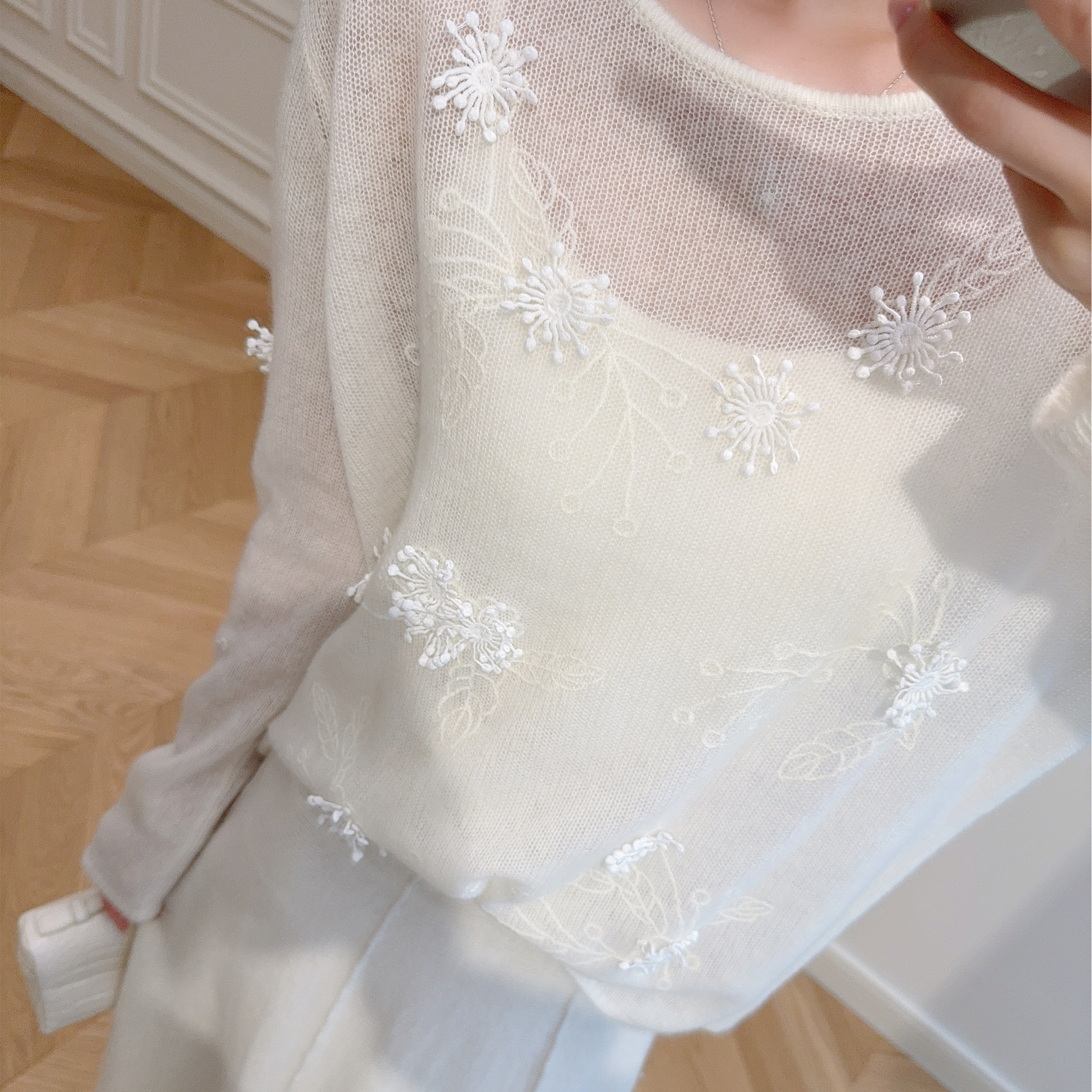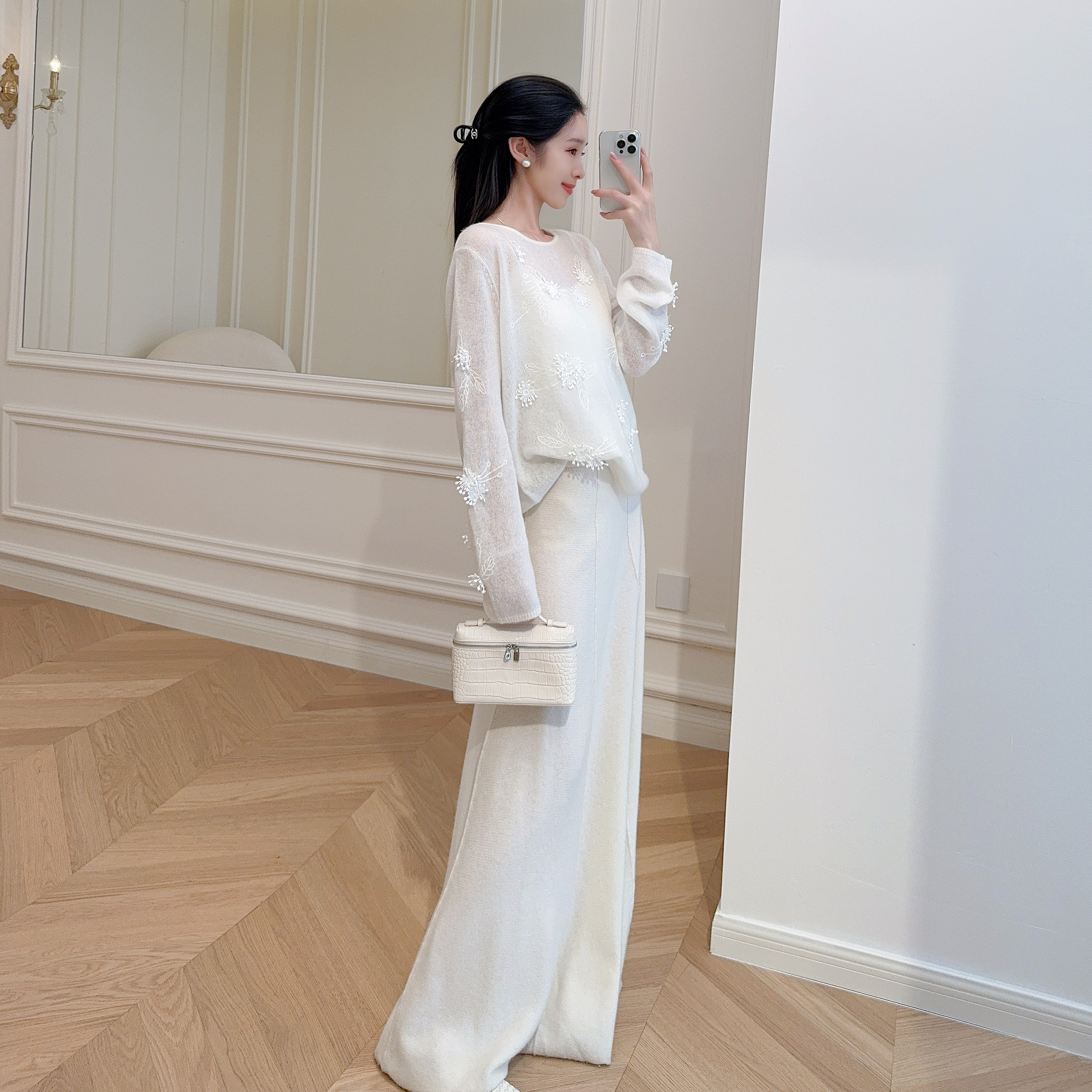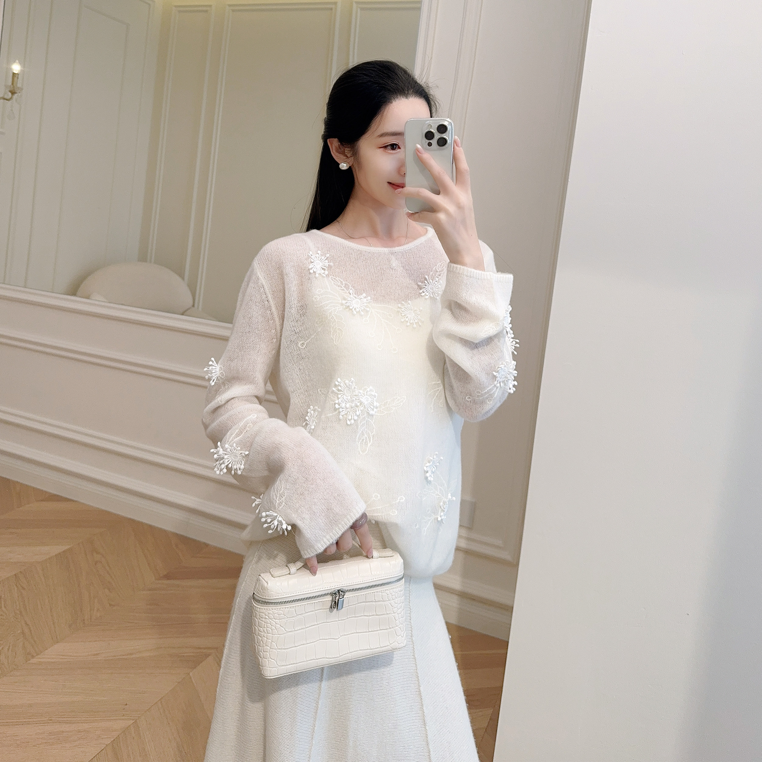 羊绒衫 白色立体钉花宽松显瘦圆领长袖 早秋新品 嫚渡100%山羊绒