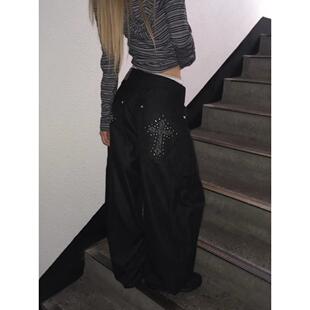 高街设计感宽松显瘦阔腿裤 女春秋款 复古豹纹十字架弯刀牛仔裤 美式