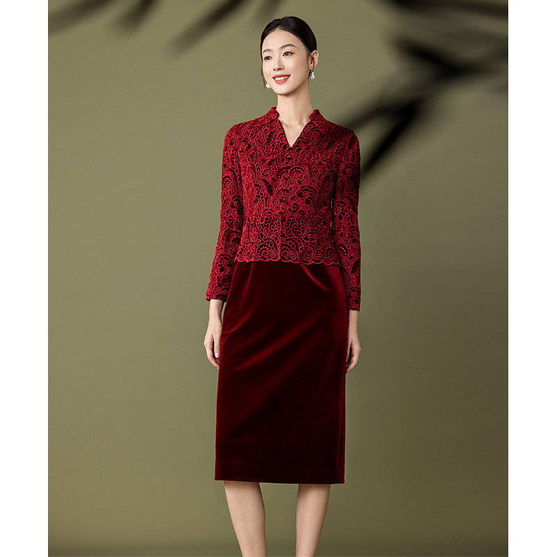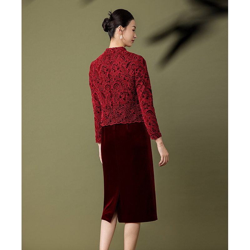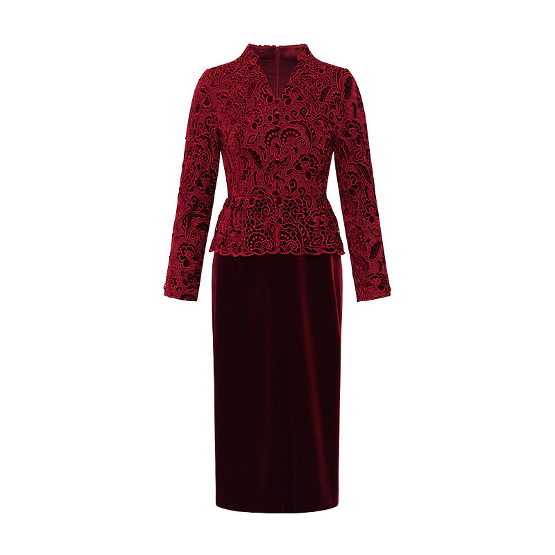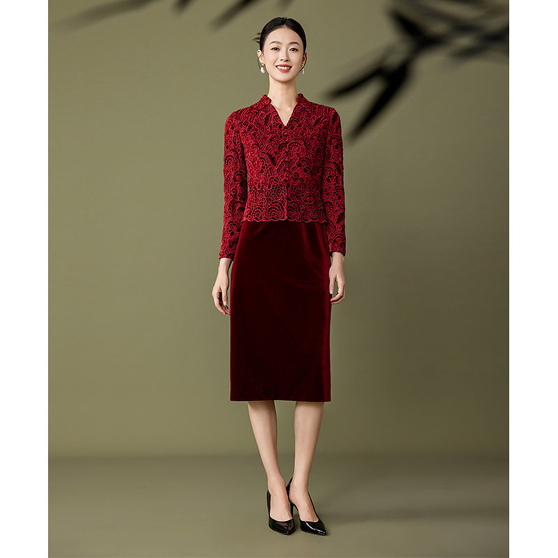 黛玛诗秋冬新款 婚宴礼服假两件拼接蕾丝连衣裙女优雅 高级感妈妈装