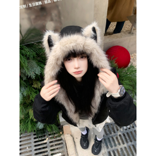 黑色猫耳朵毛领棉服加厚外套女2025冬装 超好看复古座山雕棉衣 新款