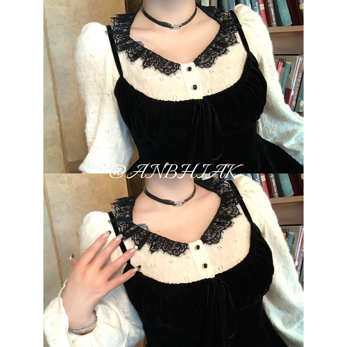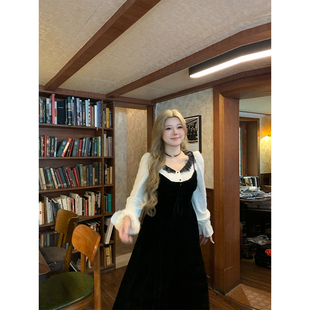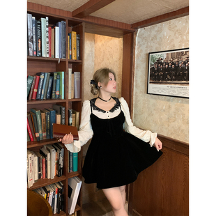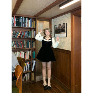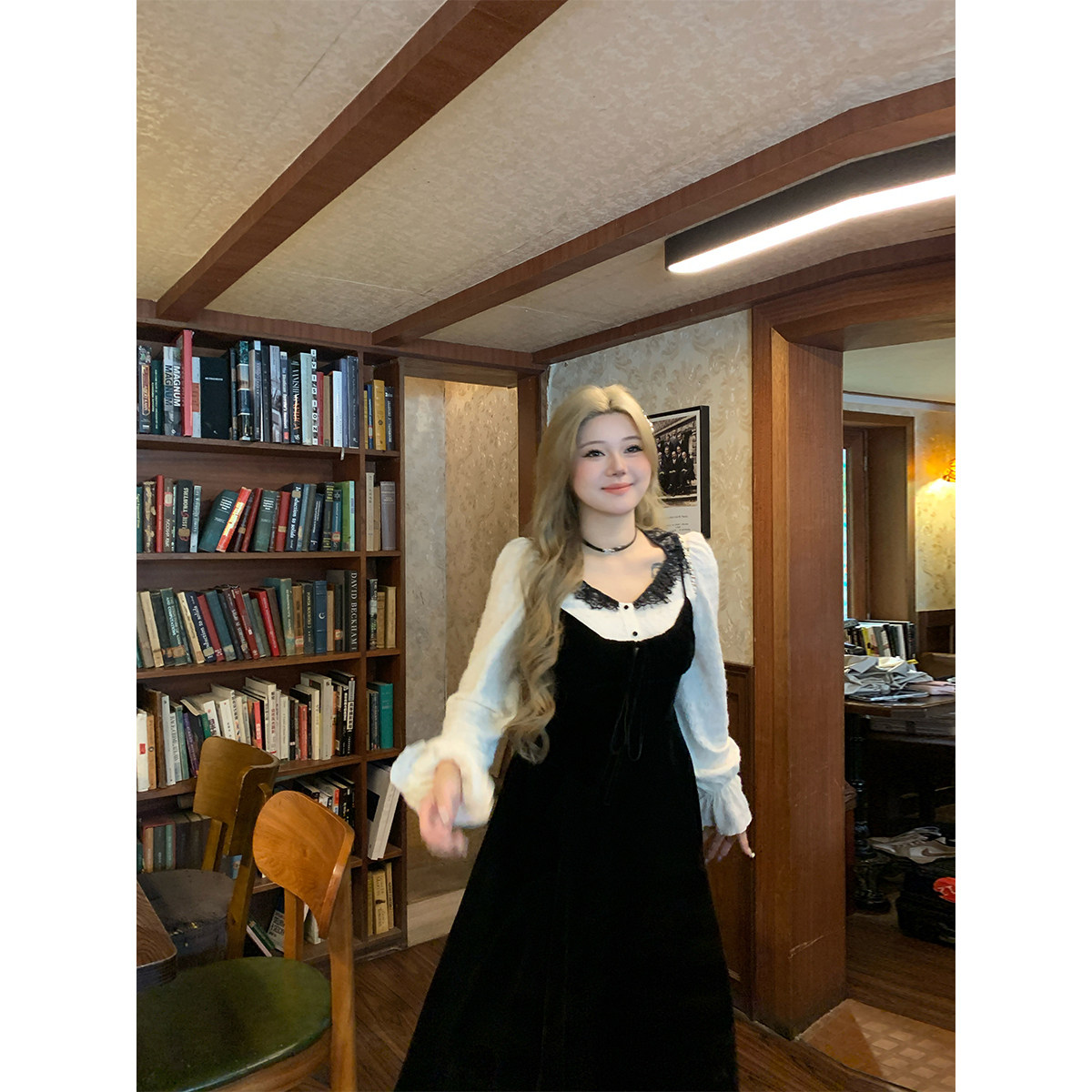 安妮不火 气质收腰裙子 千金风灯芯绒蕾丝花边领连衣裙女微胖大码