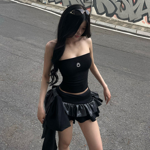 A字裙短裙 设计感修身 怪诞女孩 甜酷风辣妹PU皮拼接高腰半身裙女