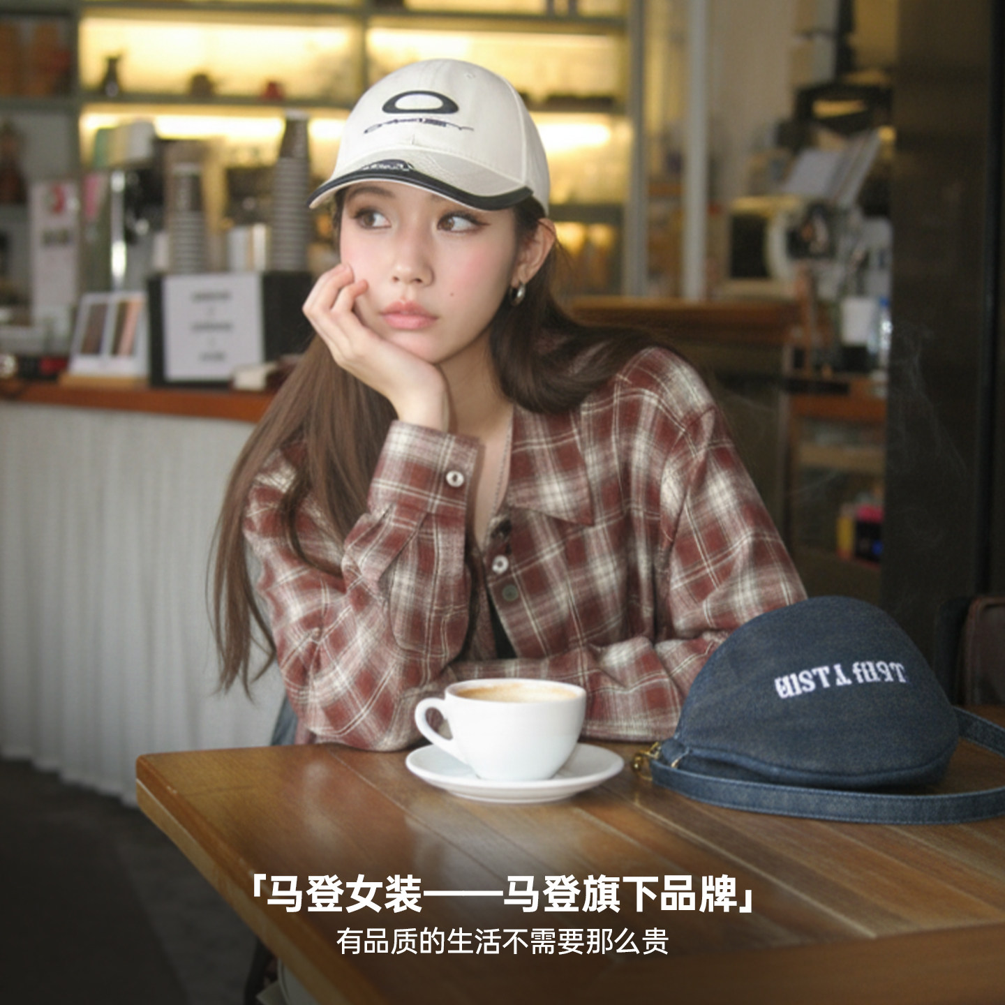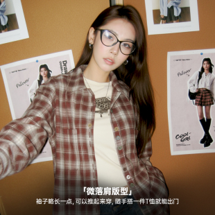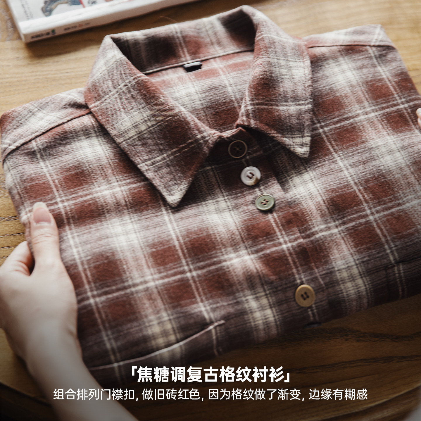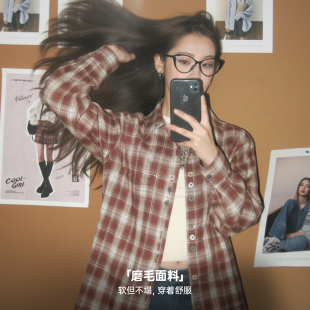 外套上衣女士春季 马登美拉德棕咖色系格子纹长袖 衬衣宽松磨毛衬衫