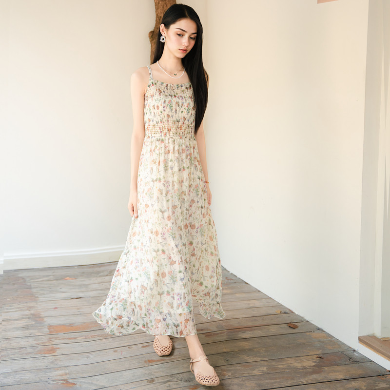 谜底桑蚕丝吊带裙2025秋季 清新柔美花色长裙连衣裙257ML7789 新款