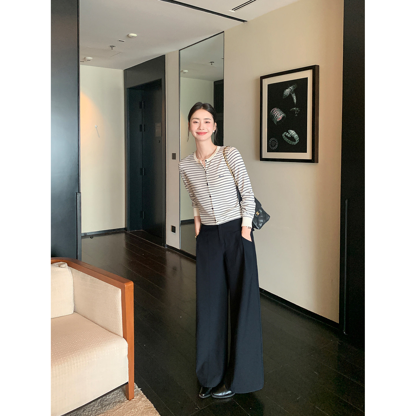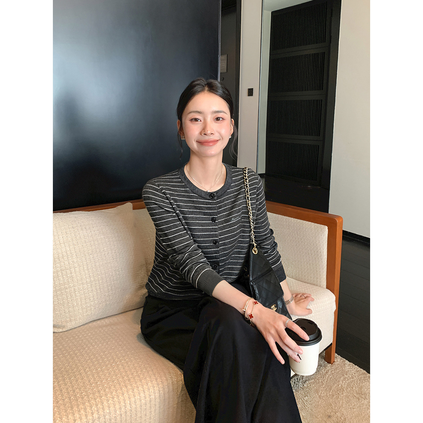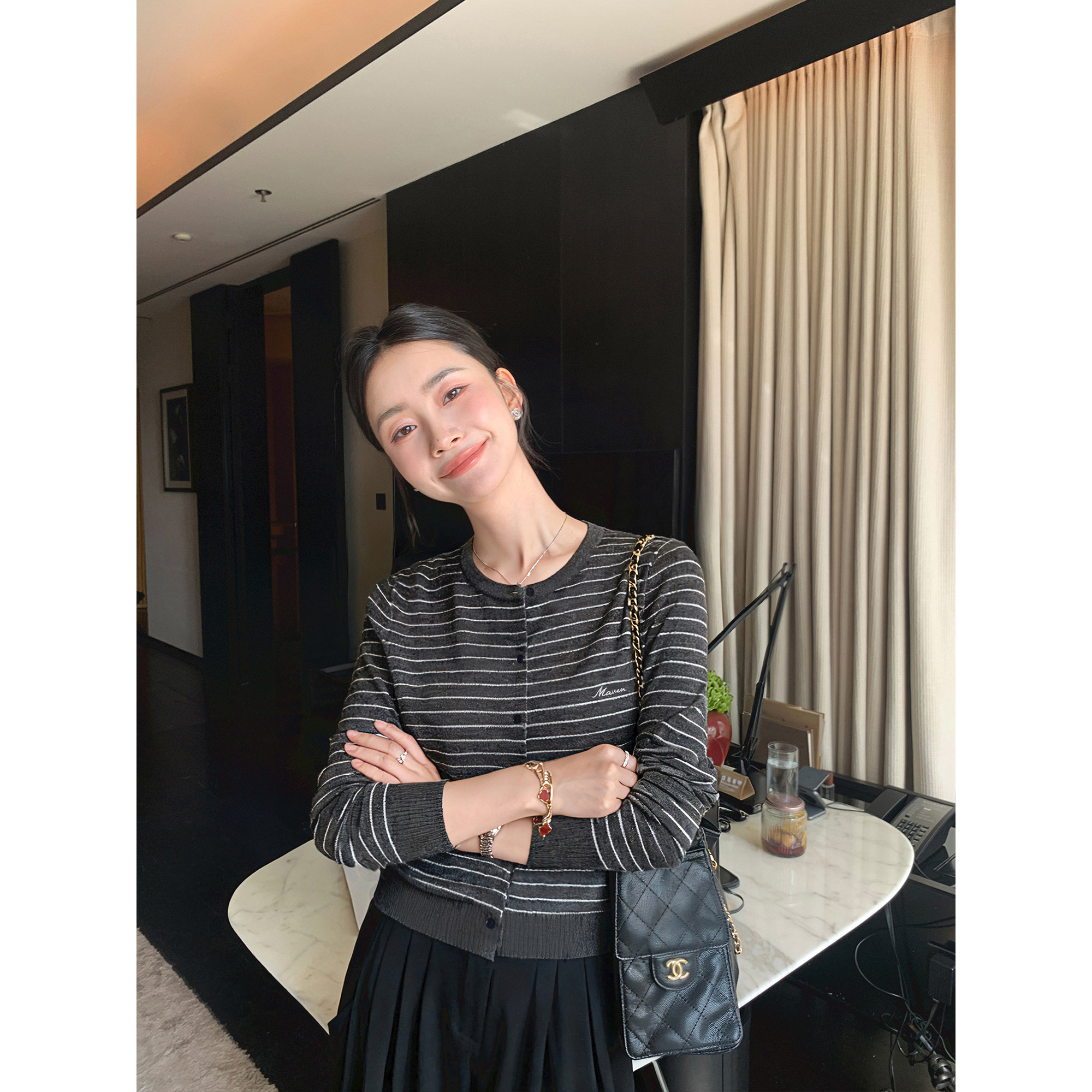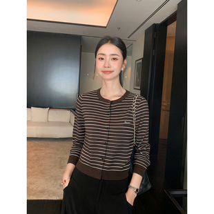 经典 FIT高智风 复古条纹圆领长袖 针织衫 上衣 Maven 女气质开衫 Lin