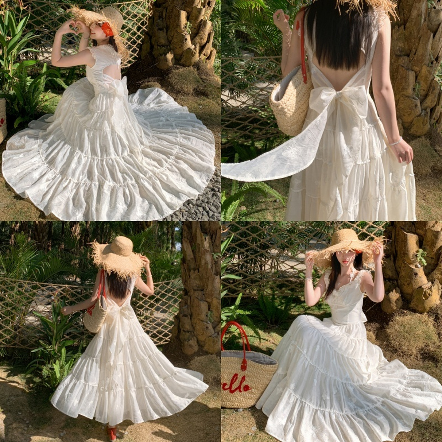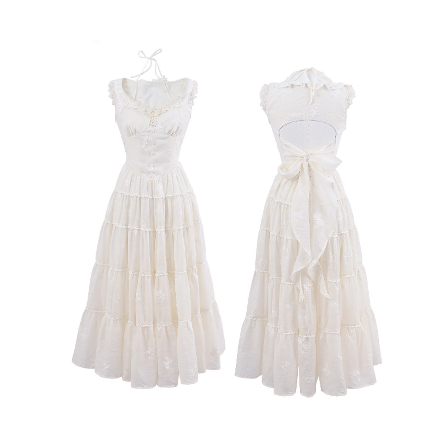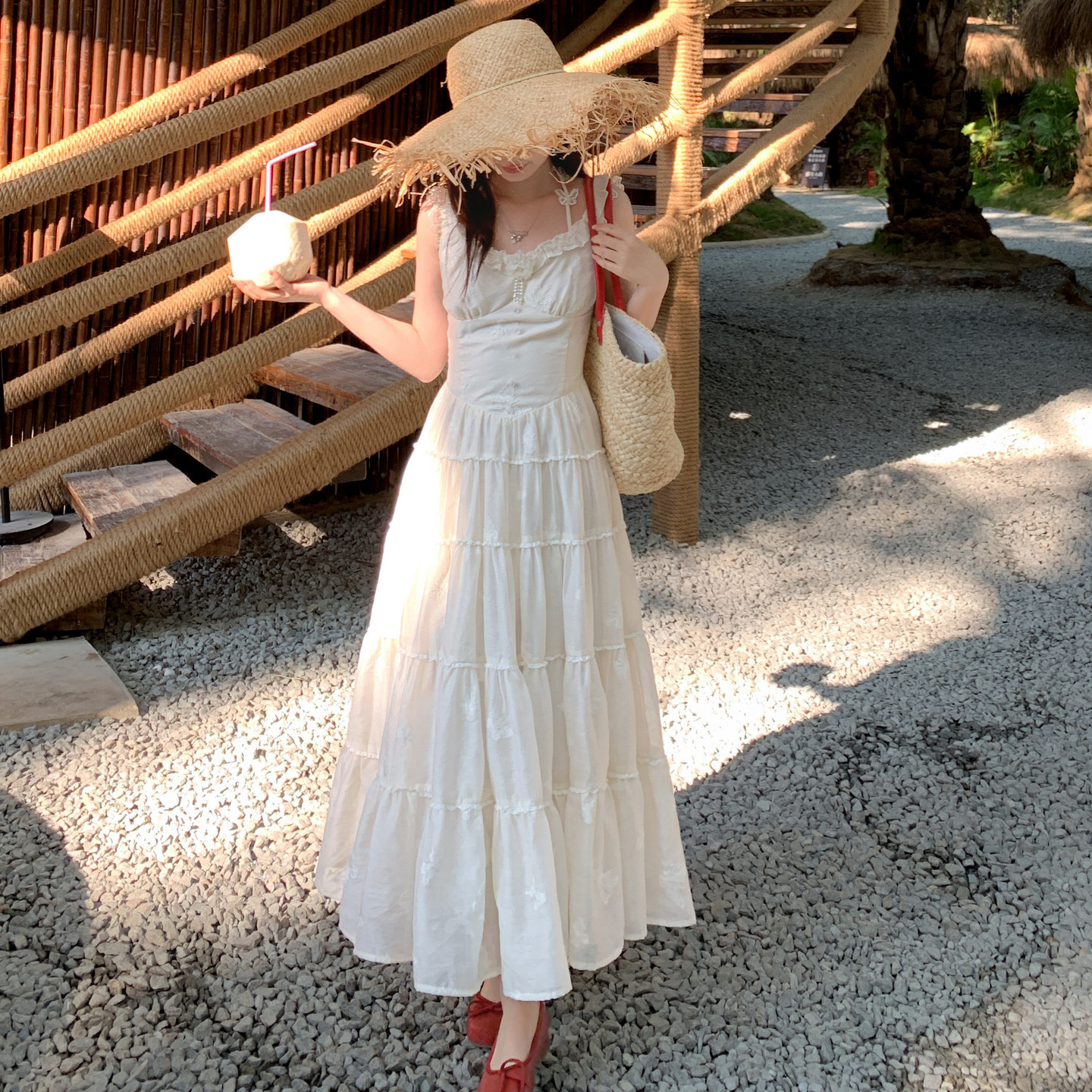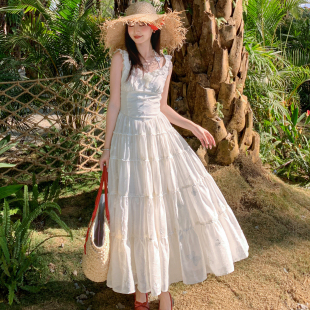 森女部落度假风蝴蝶连衣裙女夏白色多层大摆收腰显瘦仙系甜妹长裙