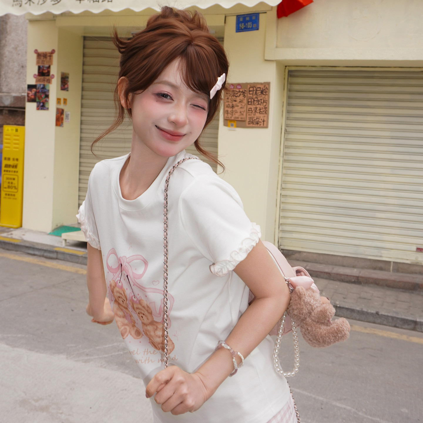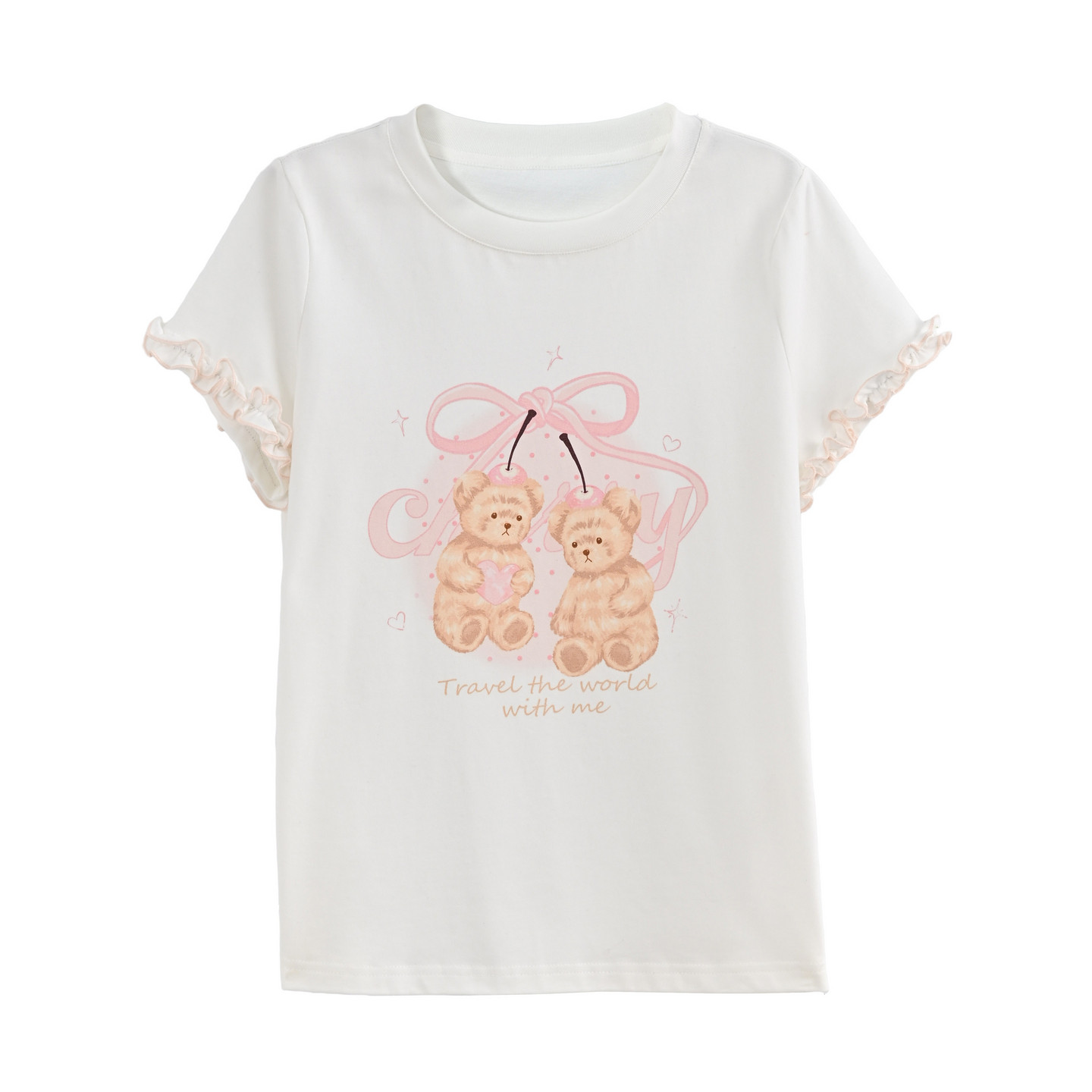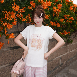 森女部落甜美可爱小熊印花宽松显瘦短袖 百搭纯棉上衣夏 T恤女新款