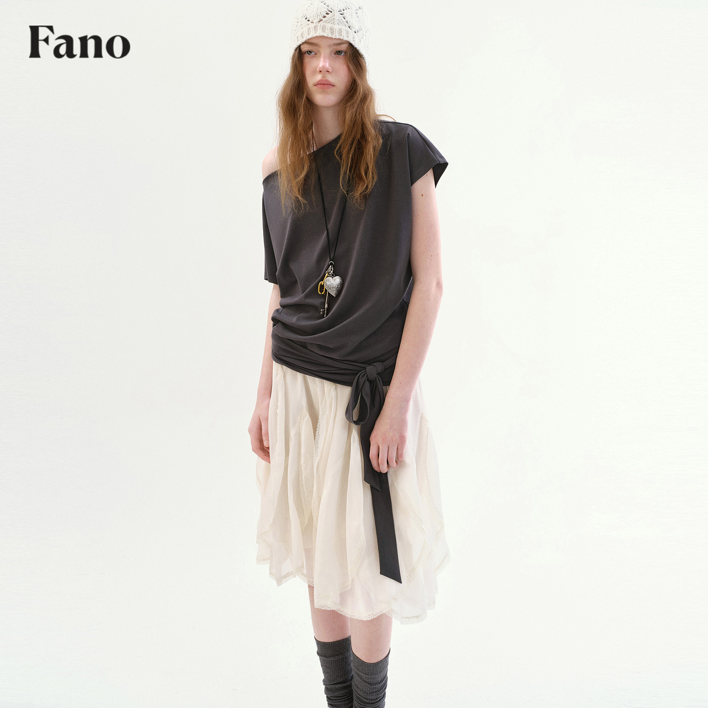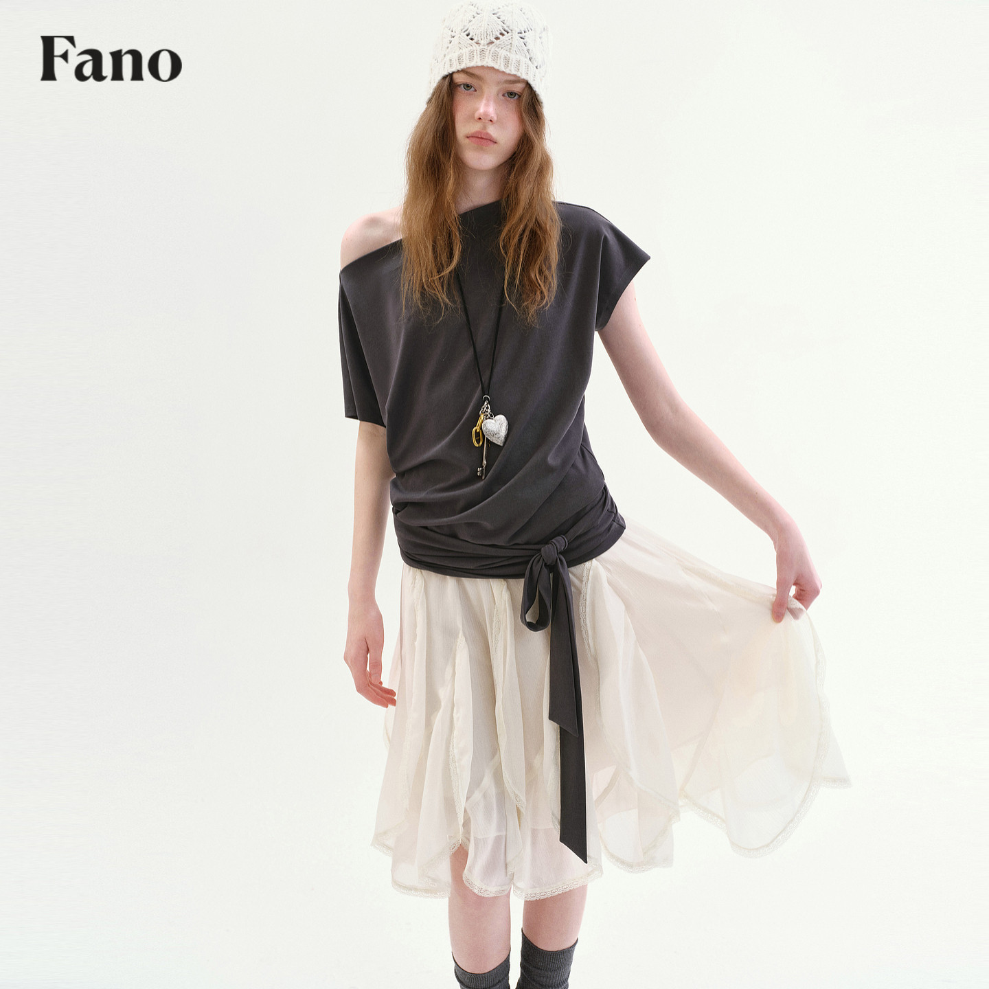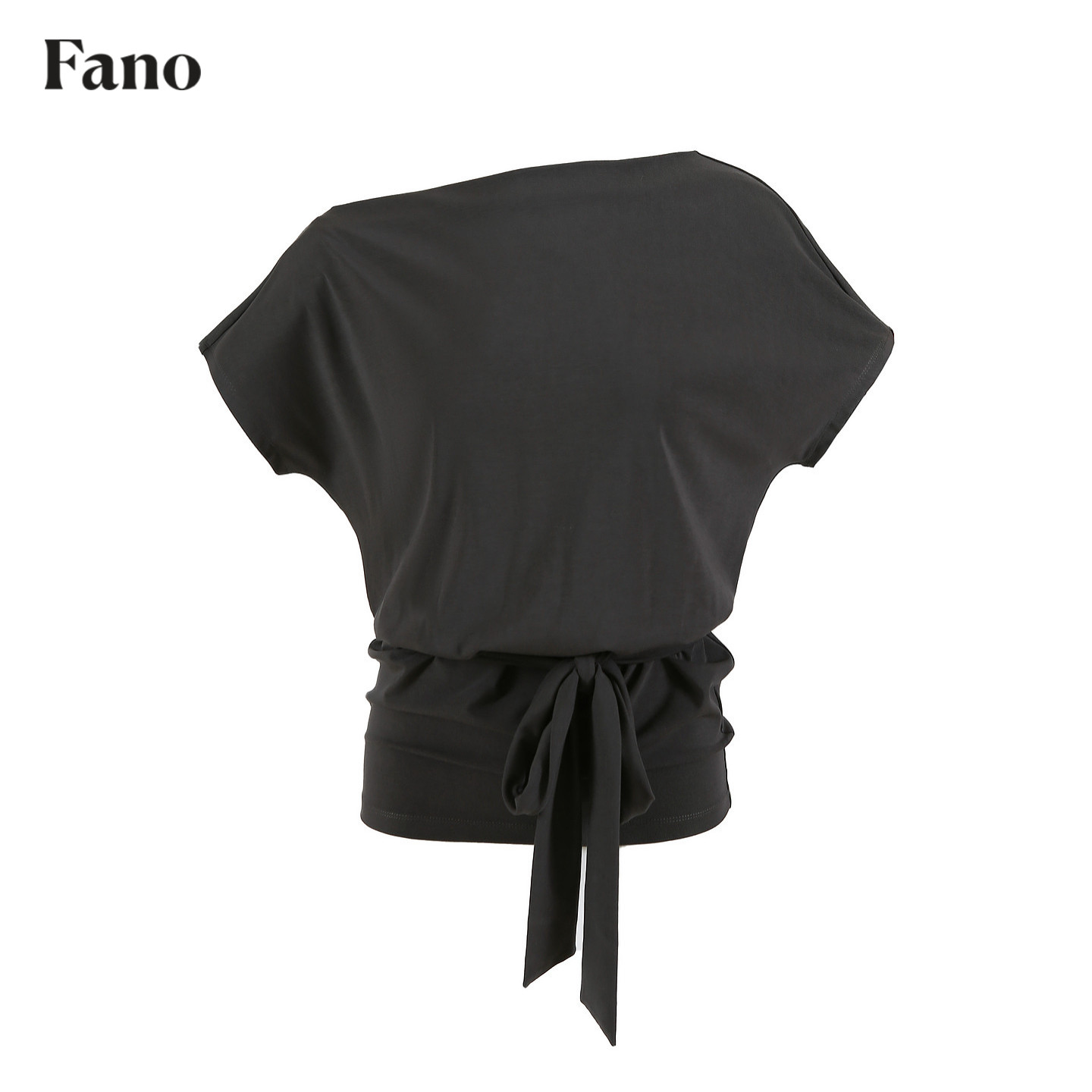 新款 范洛Fano T恤女2026春季 慵懒感蝙蝠袖 一字领斜肩绑带上衣 法式
