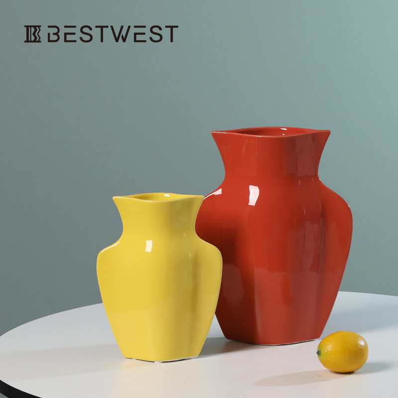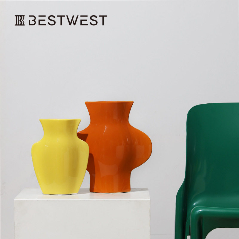 饰品花器 高档家居软装 博西家居 创意彩色亮面扁形水培陶瓷花瓶