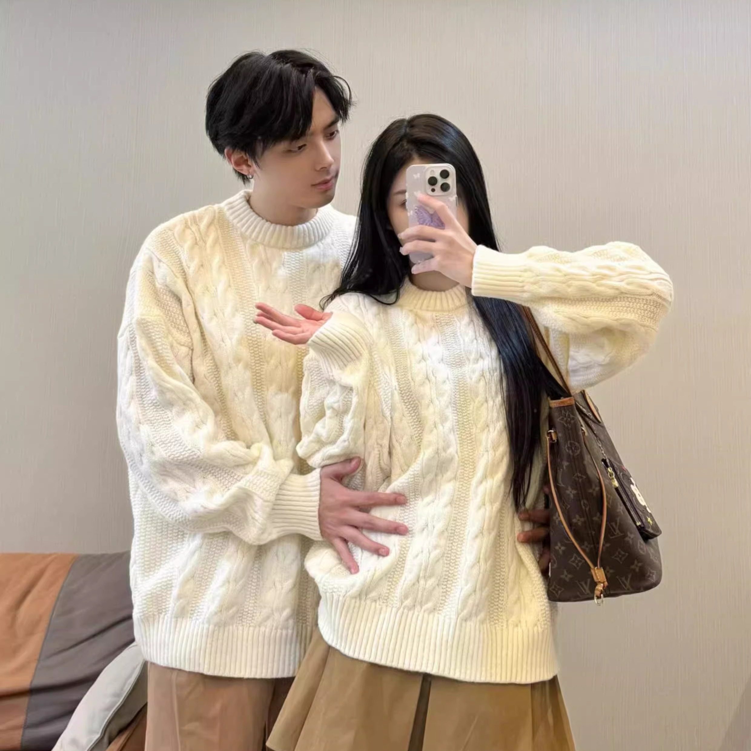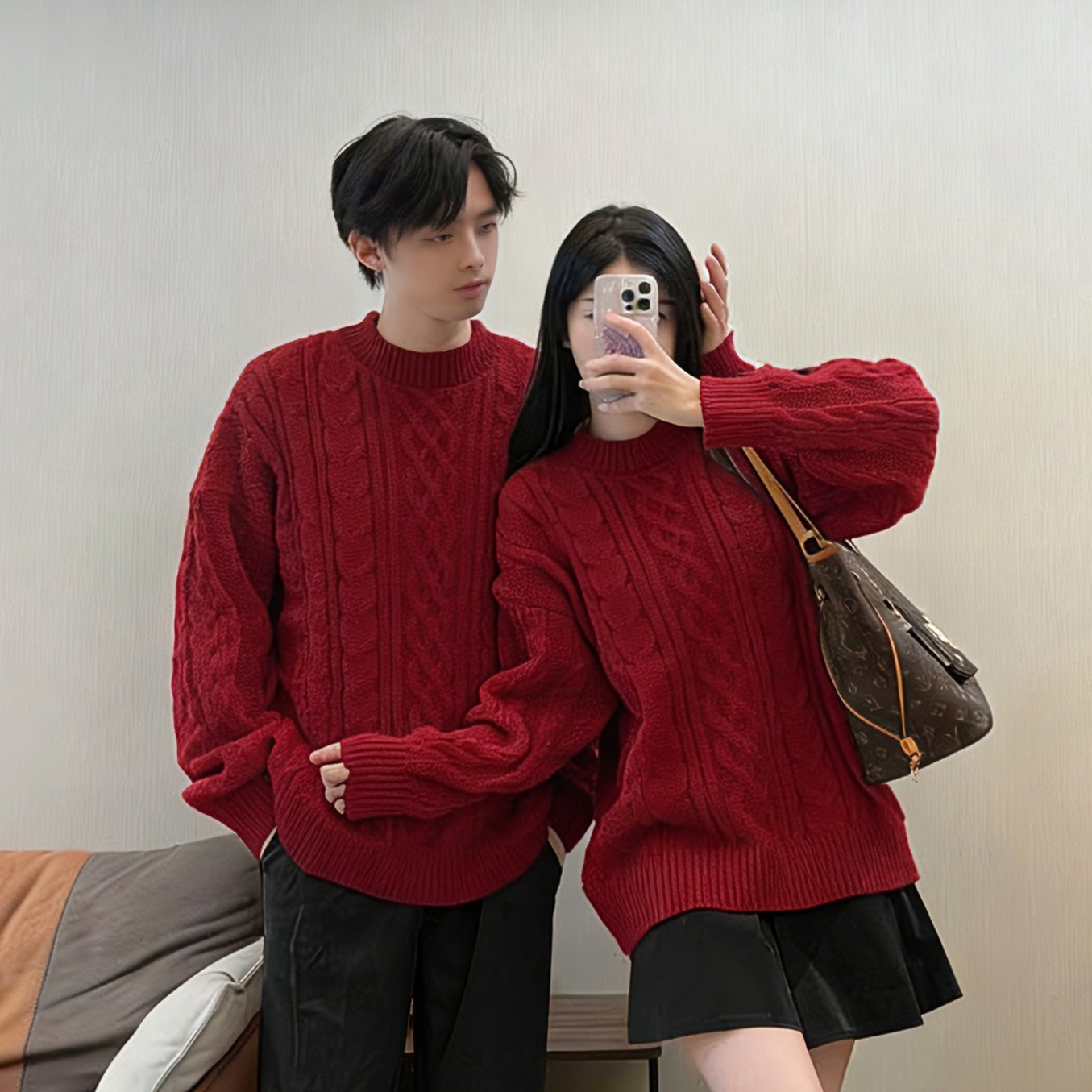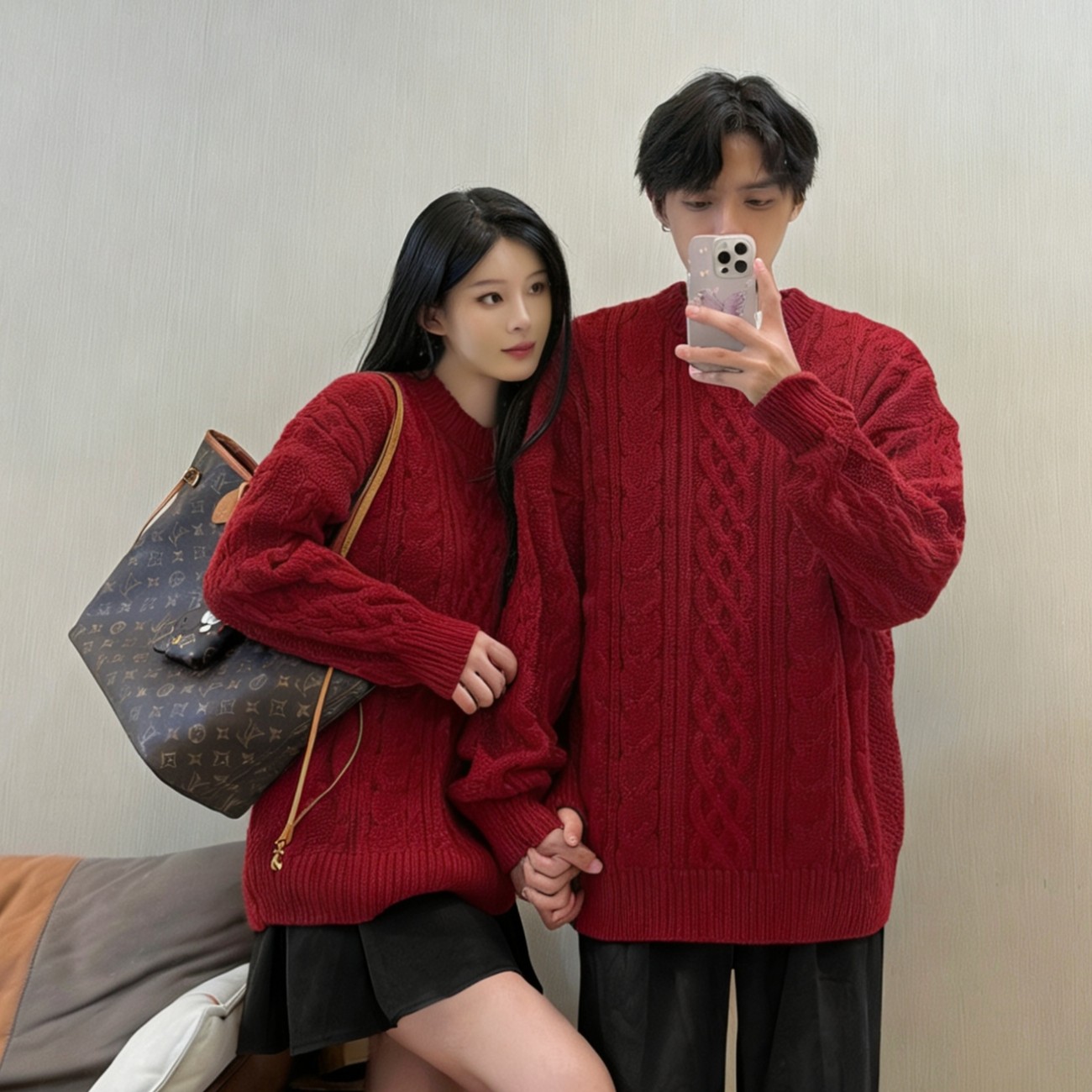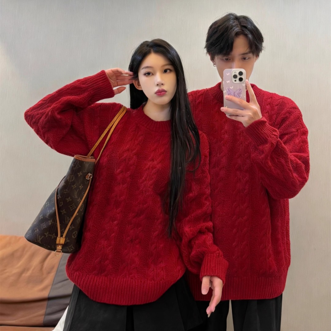 本命年穿搭 麻花毛衣女中性慵懒风宽松新年装 红色情侣装 毛衣秋冬装