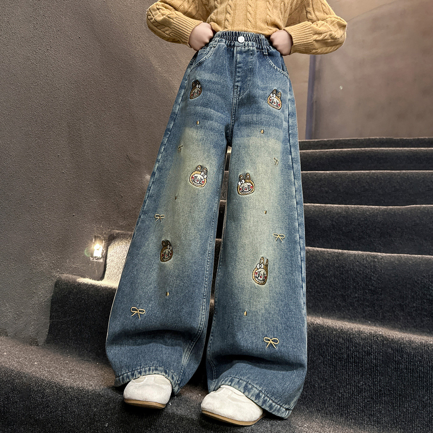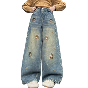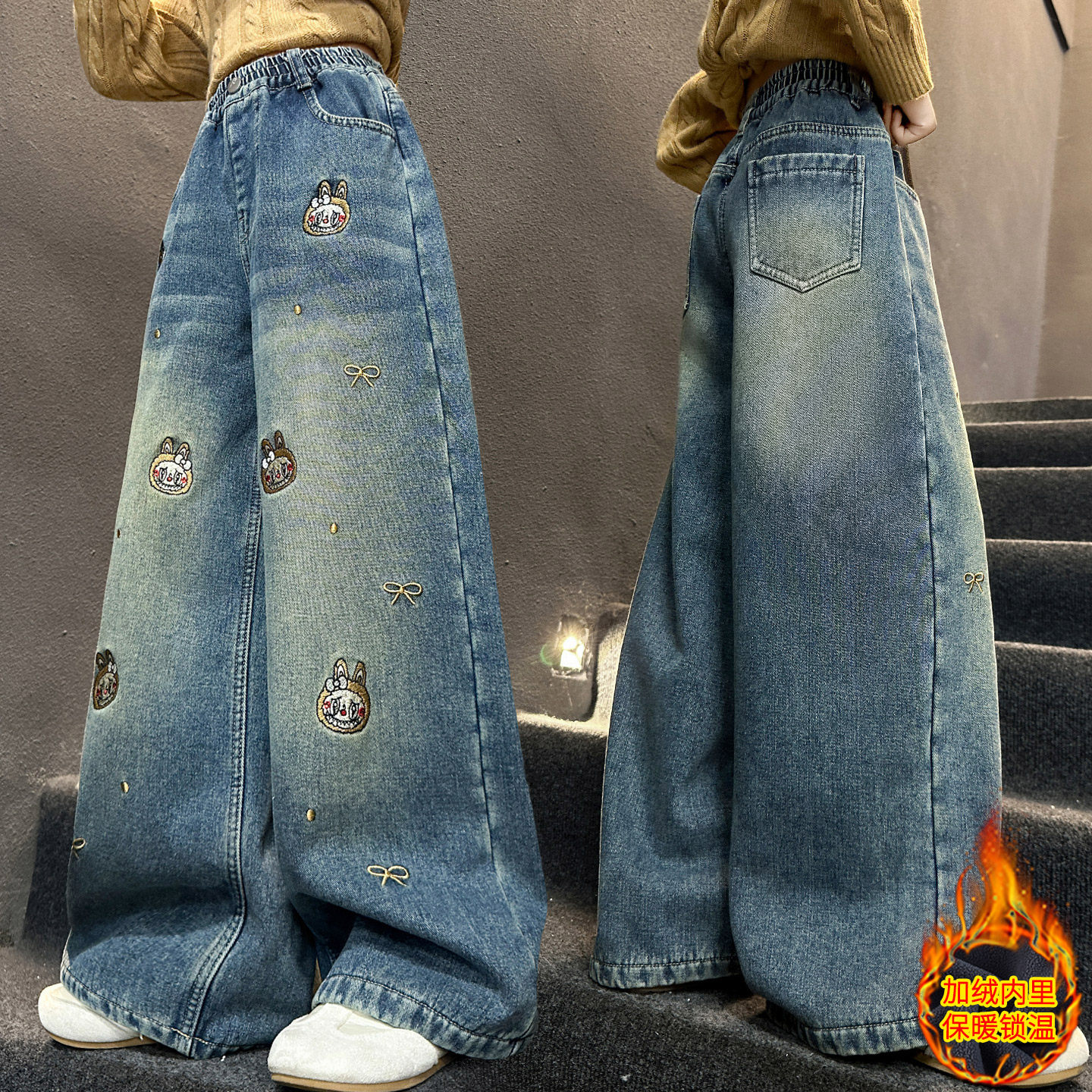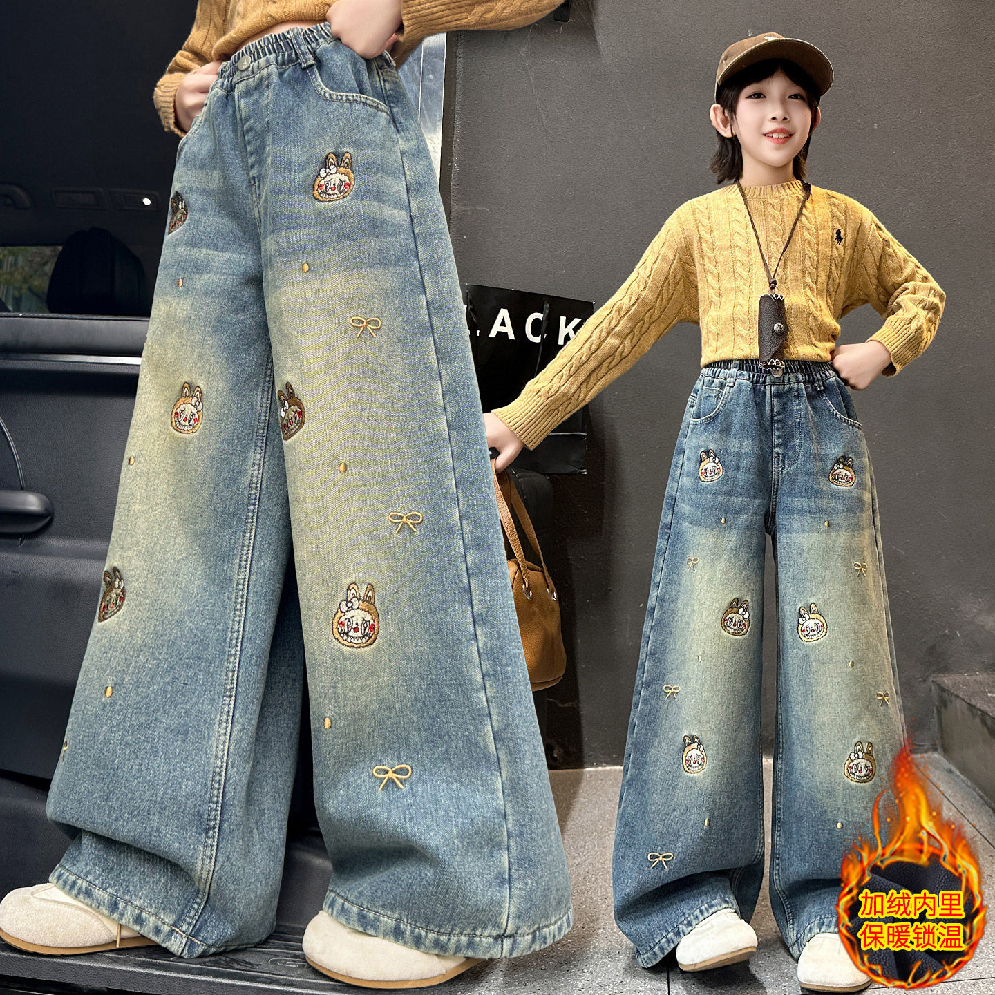 子2025新款 潮酷百搭阔腿裤 冬季 宽松韩版 加厚女孩牛仔裤 女童加绒裤