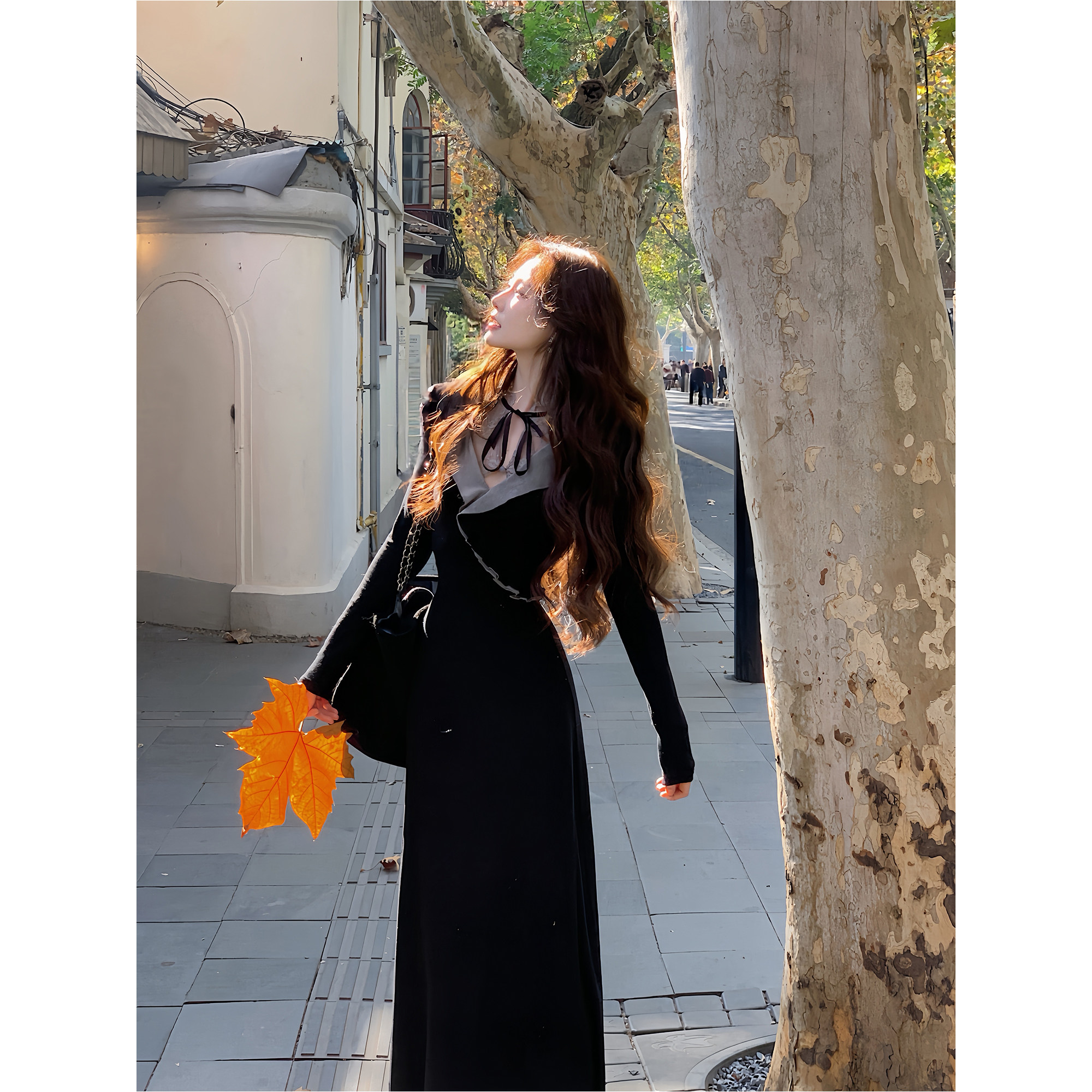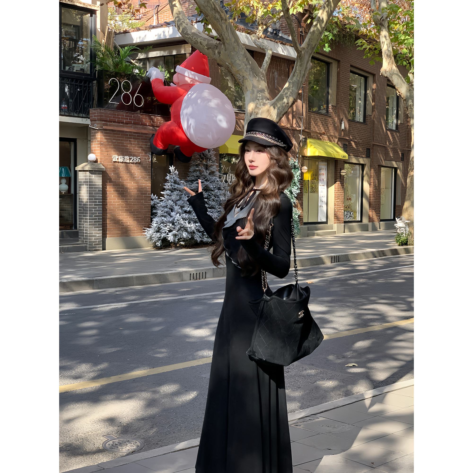 长款 极简收腰中领内搭打底小黑裙女冬季 连衣裙 加绒经典 郭九九呢