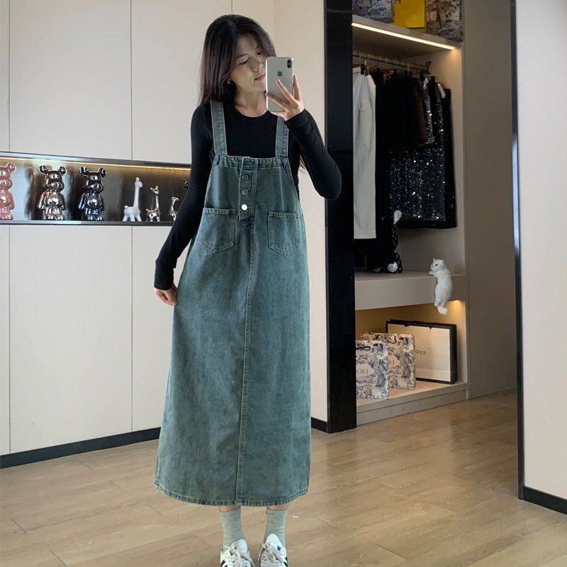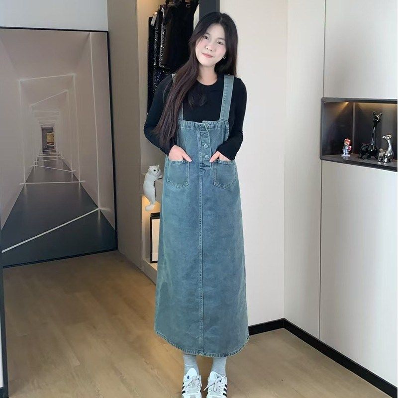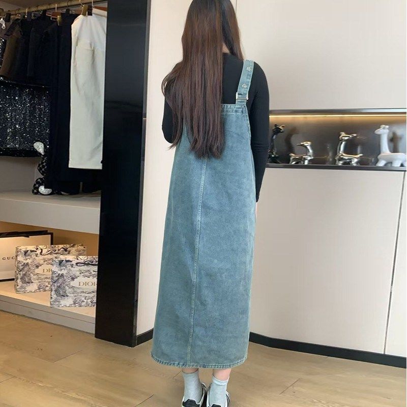 孕妇牛仔背带连衣裙女春秋时尚 宽松复古蓝显瘦长裙 百搭裙子秋冬装