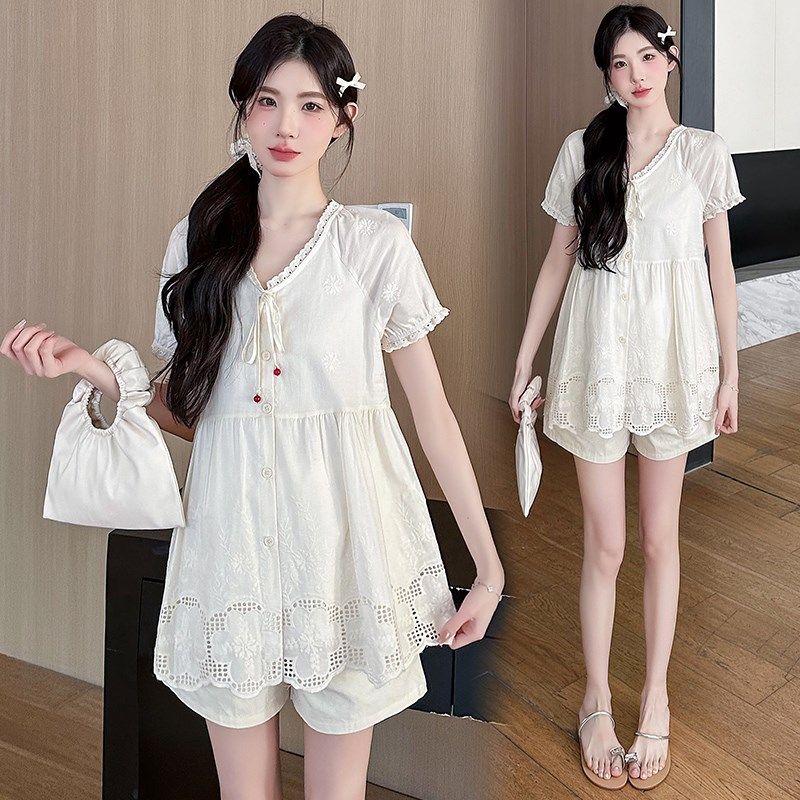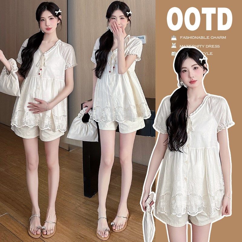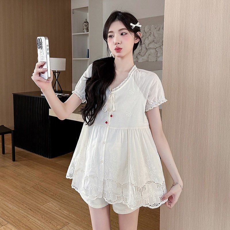 夏装 宽松休闲娃娃衫 蕾丝镂空泡泡袖 甜美减龄衬衫 夏 上衣夏季 孕妇装