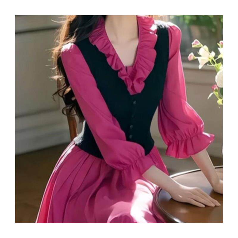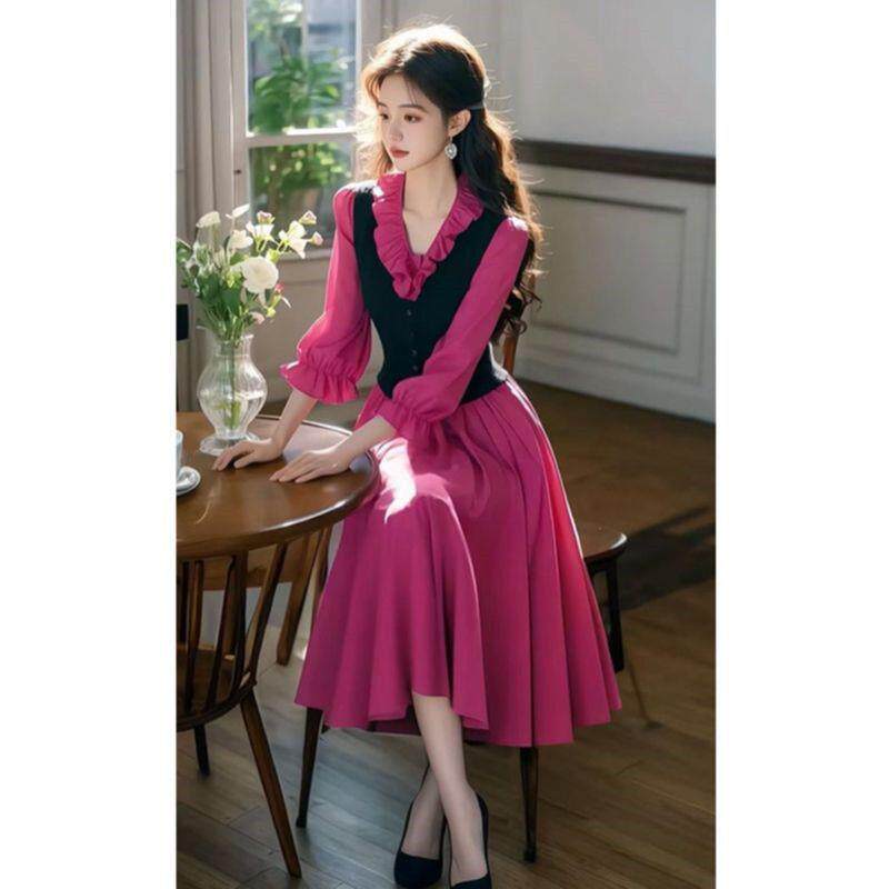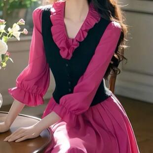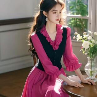 2025新款 连衣裙 富家千金穿搭假两件气质名媛高端玫红色木耳边衬衫