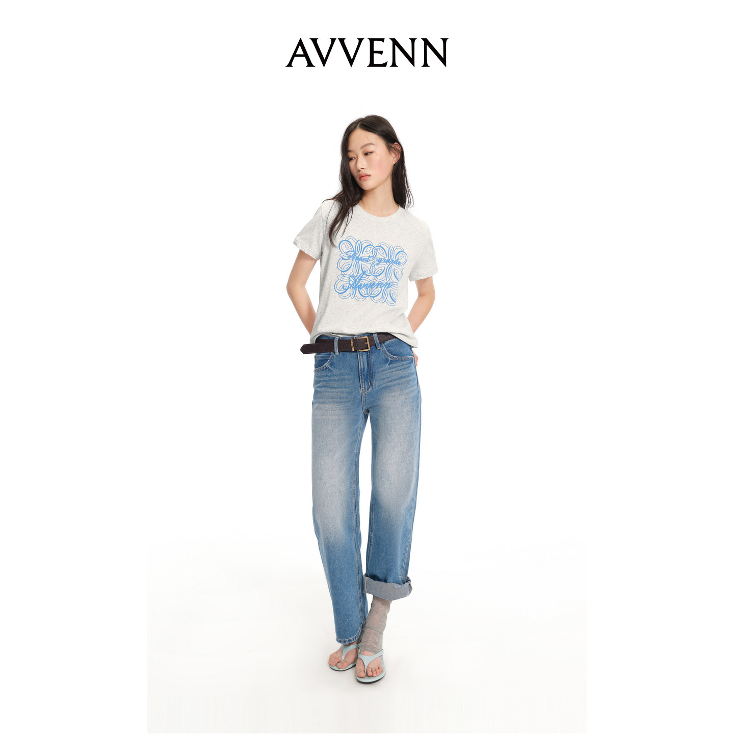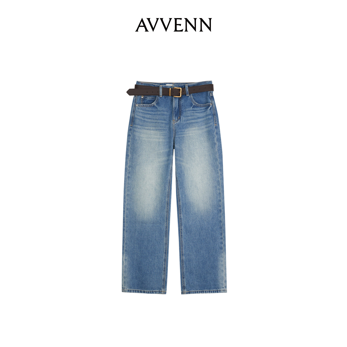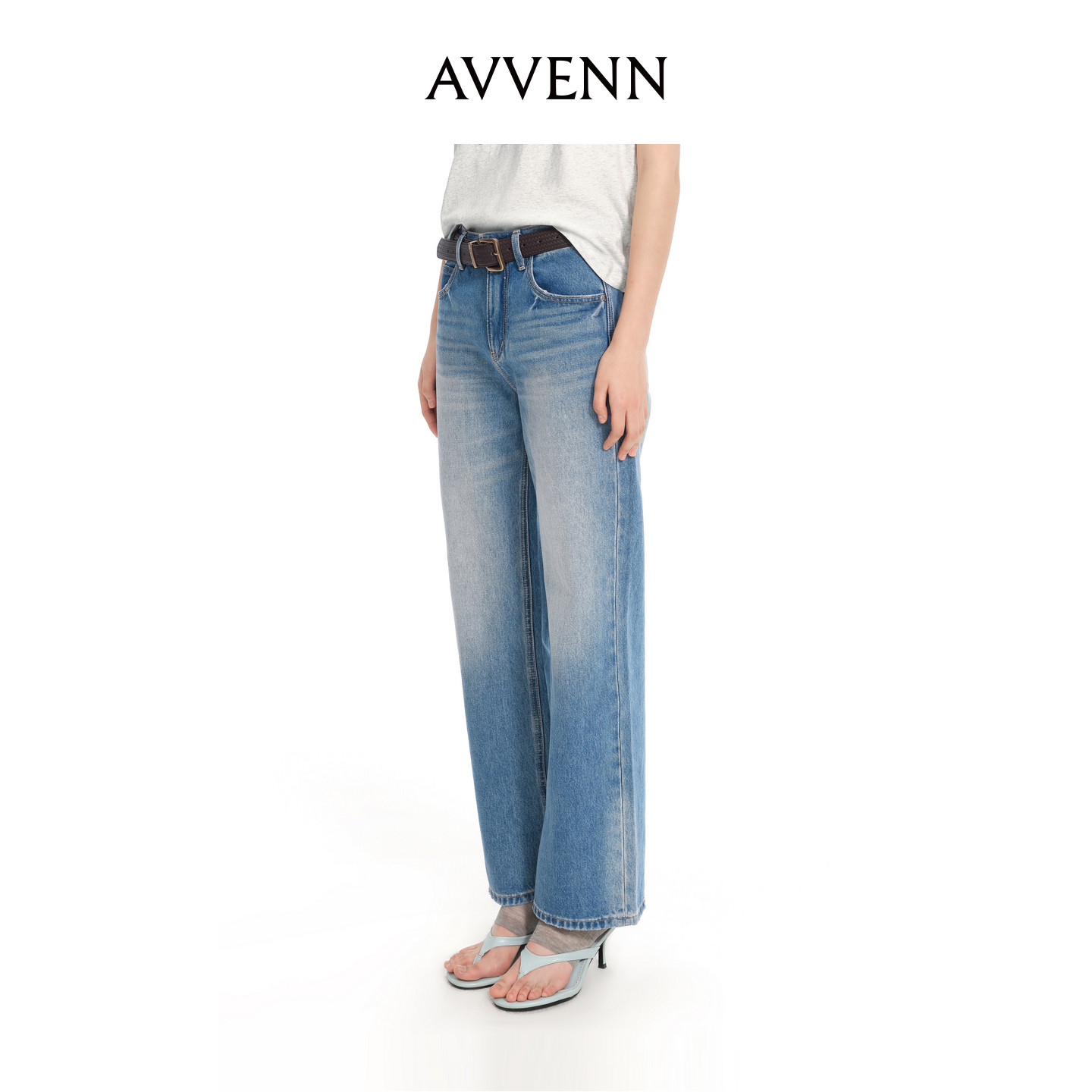 AVVENN浅色水洗直筒编织腰带牛仔长裤 AK31302630