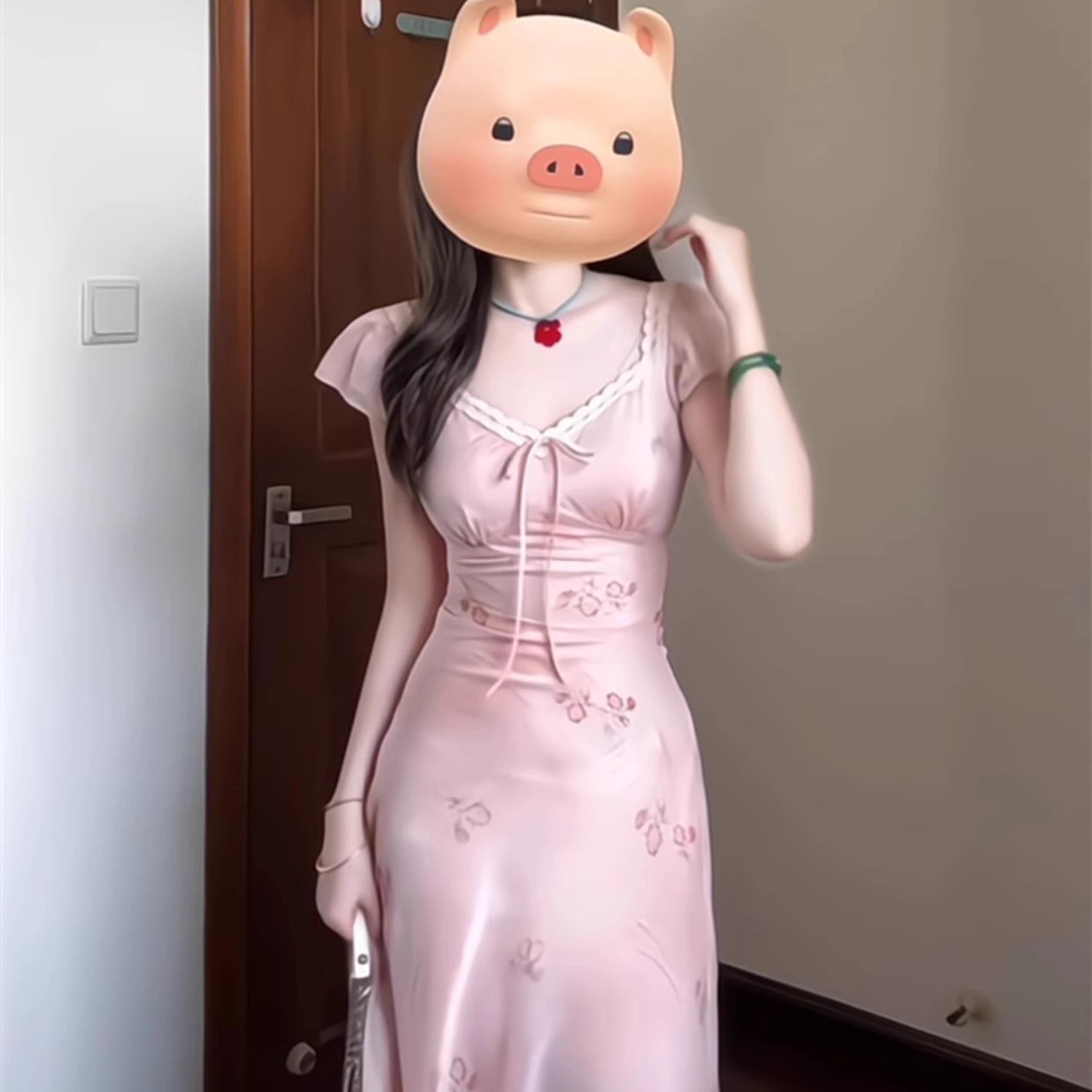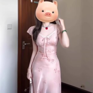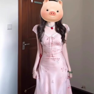 粉色连衣裙女夏2026新款 V领碎花蕾丝掐腰小个子气质长裙 穿搭法式