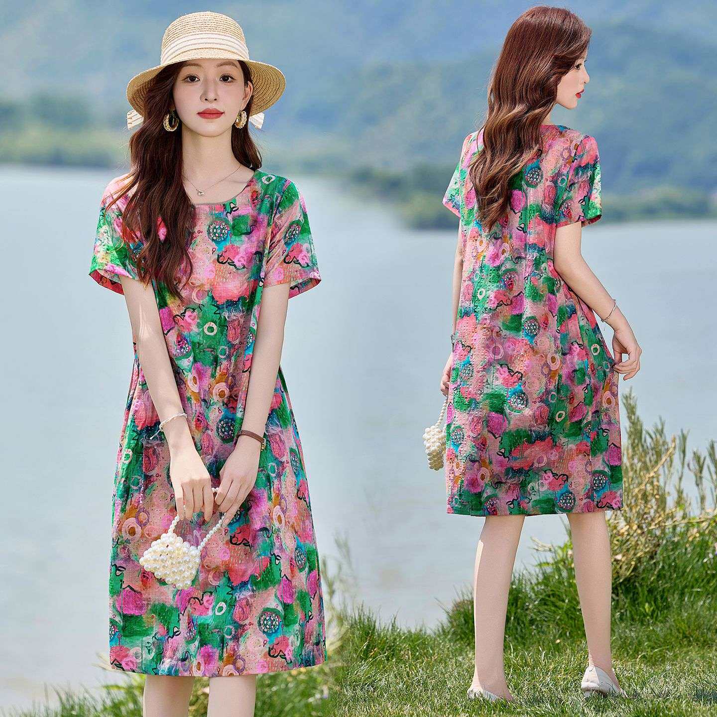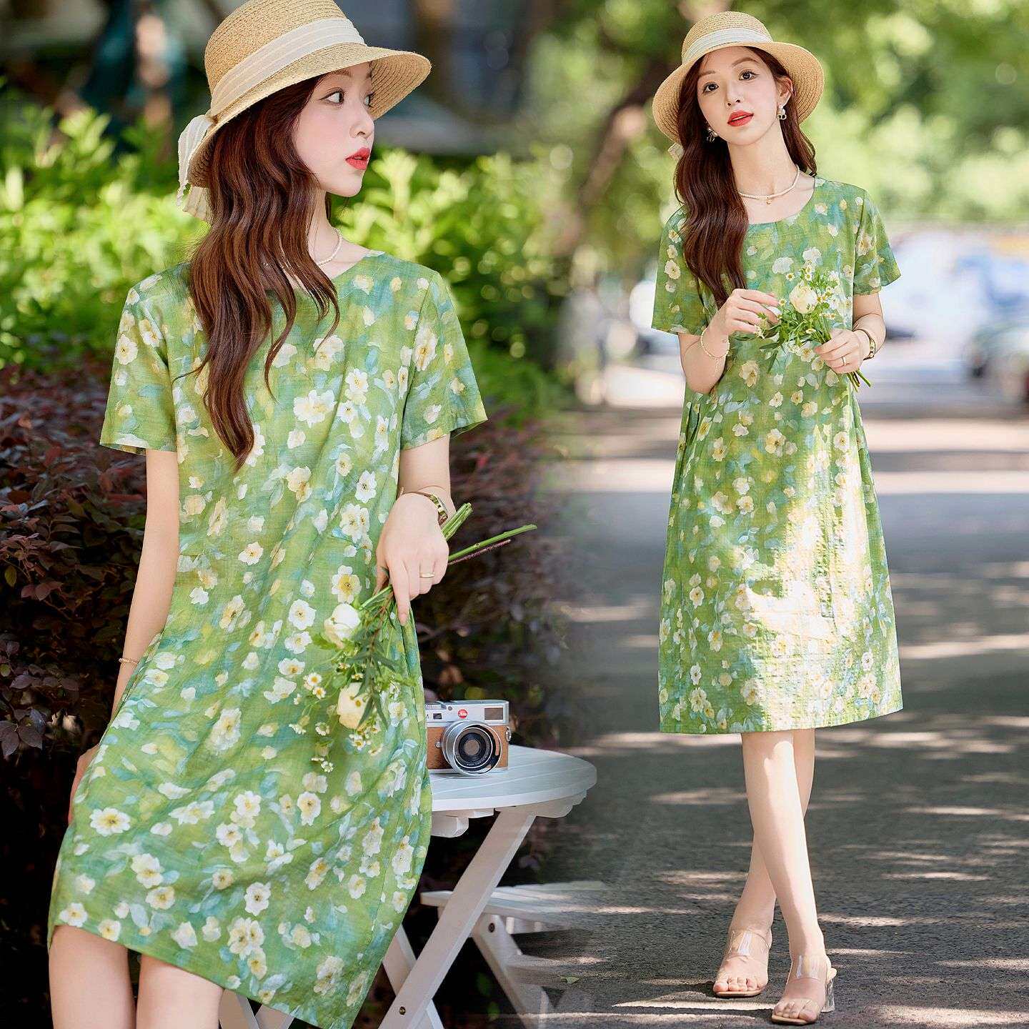 优雅绿色碎花连衣裙女夏短袖 圆领宽松遮肚洋气棉麻裙