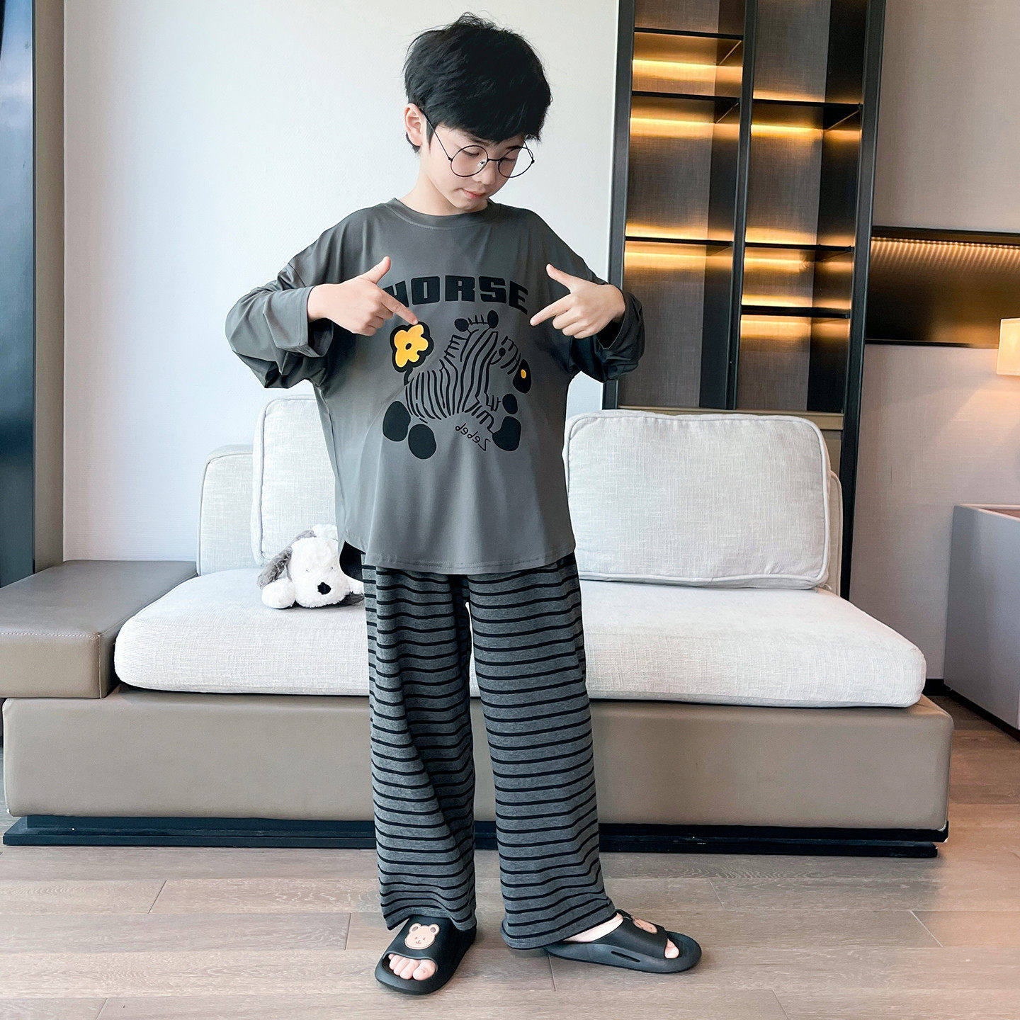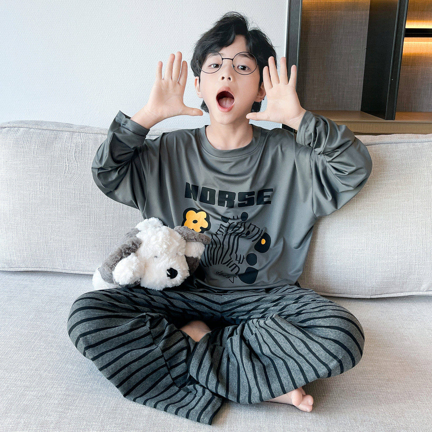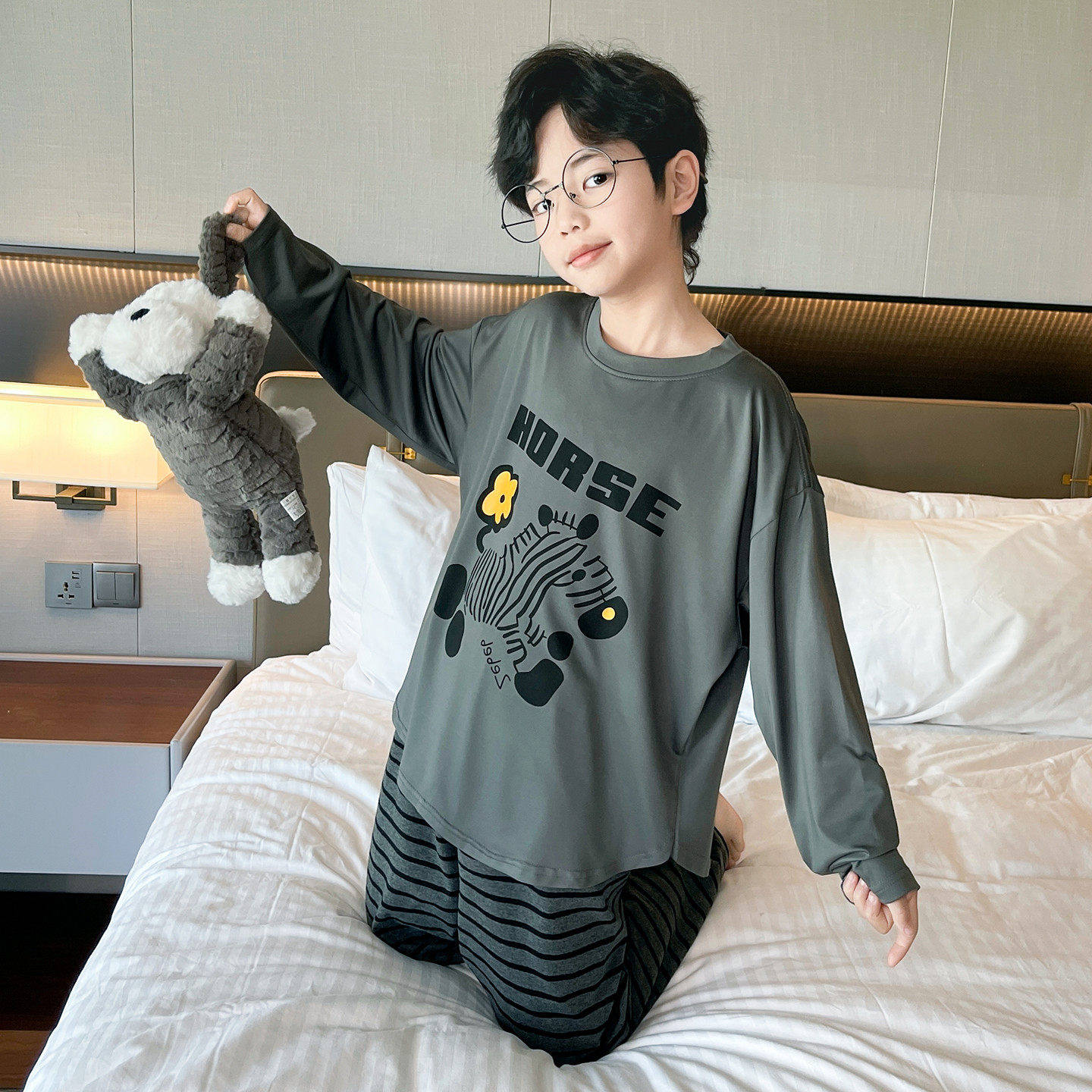 2026新款 长裤 大儿 牛奶丝睡衣男童青少年长袖 法国Anseola春夏薄款