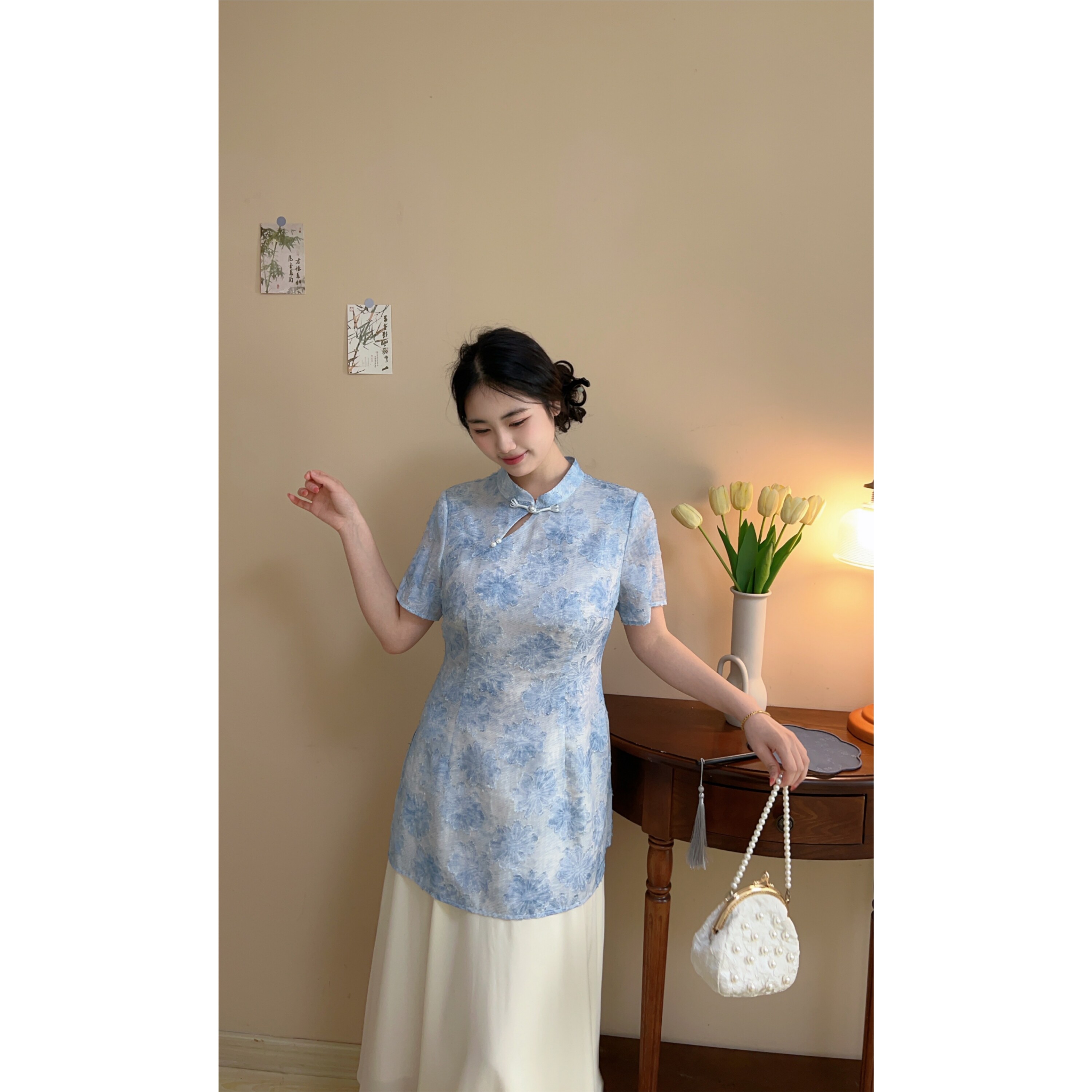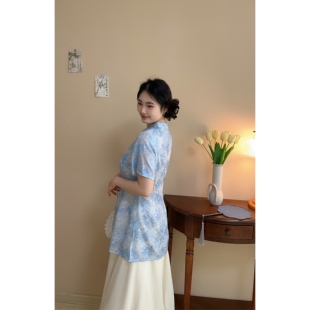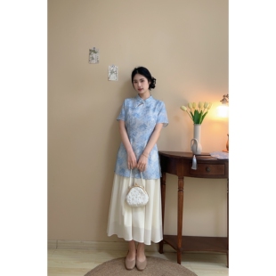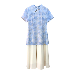 胖mm朦胧感旗袍长裙 假两件天青色水墨提花国风大码 浅黛 自制款