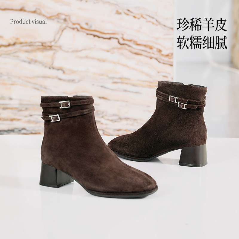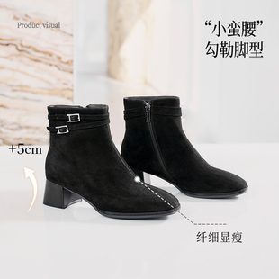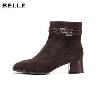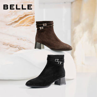 高跟短靴E5X1DDD5 冬新款 百丽双子星绒面羊皮显瘦超软时装 靴子女鞋