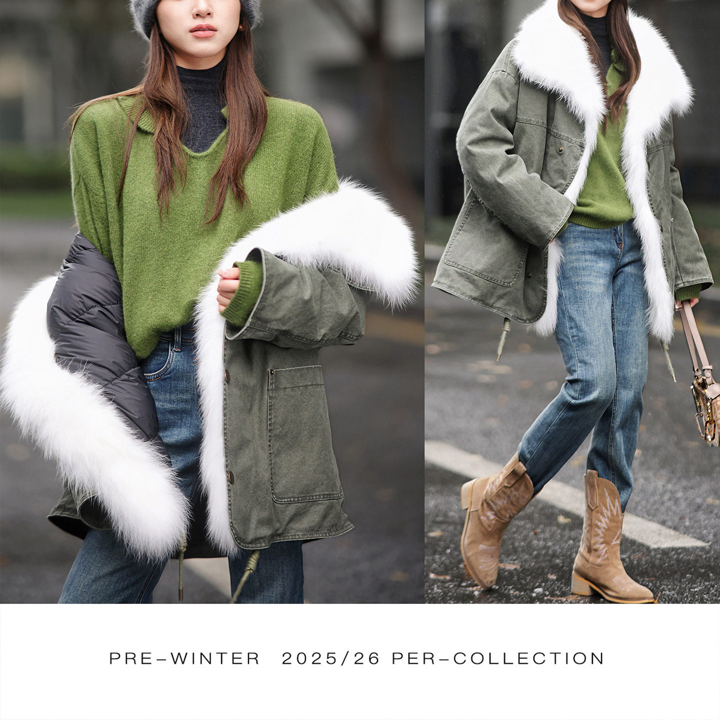 冲锋衣棉服皮草外套 工装 赵露思同款 军绿色毛领羊羔绒派克服女冬季