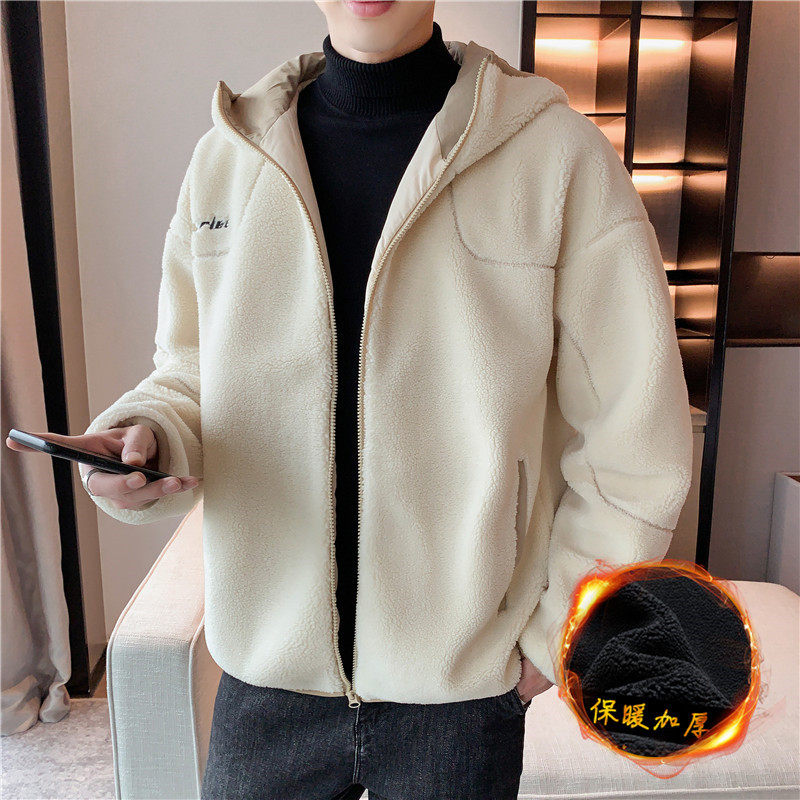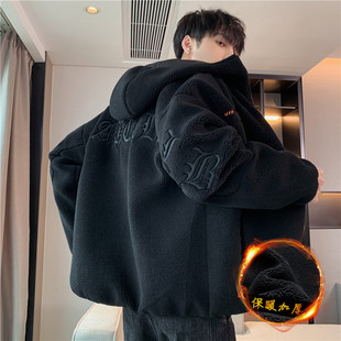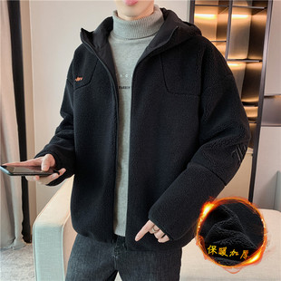 青少年羊羔绒棉衣外套男秋冬季 连帽加绒加厚保暖外套宽松绒感夹克