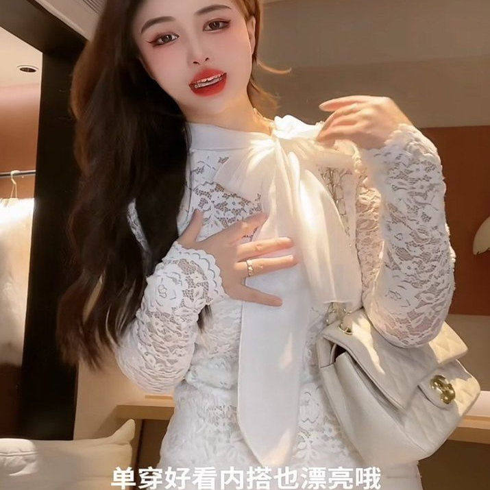 女2025秋冬新款 蕾丝衫 温柔风上衣 名媛气质甜美蝴蝶结系带长袖 法式