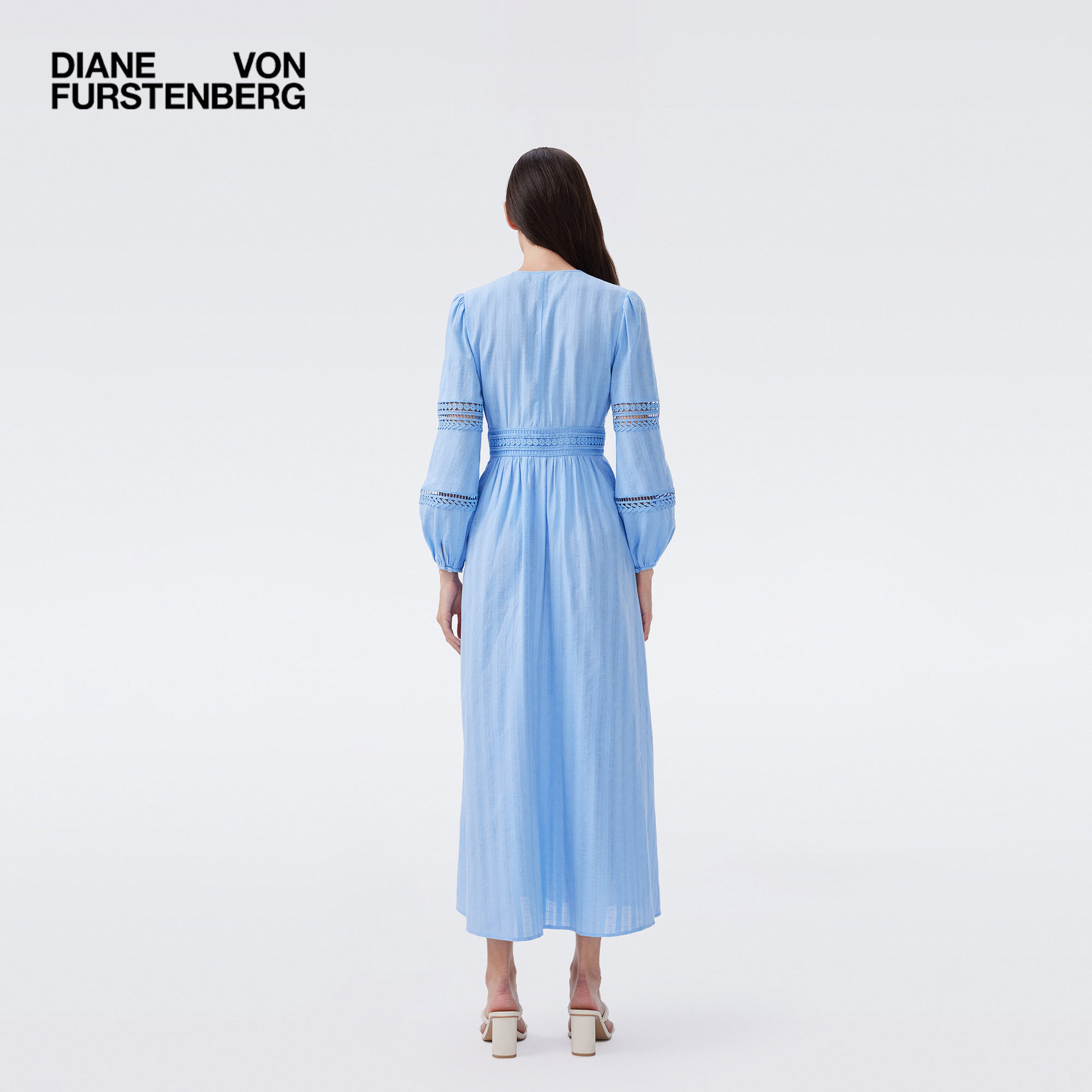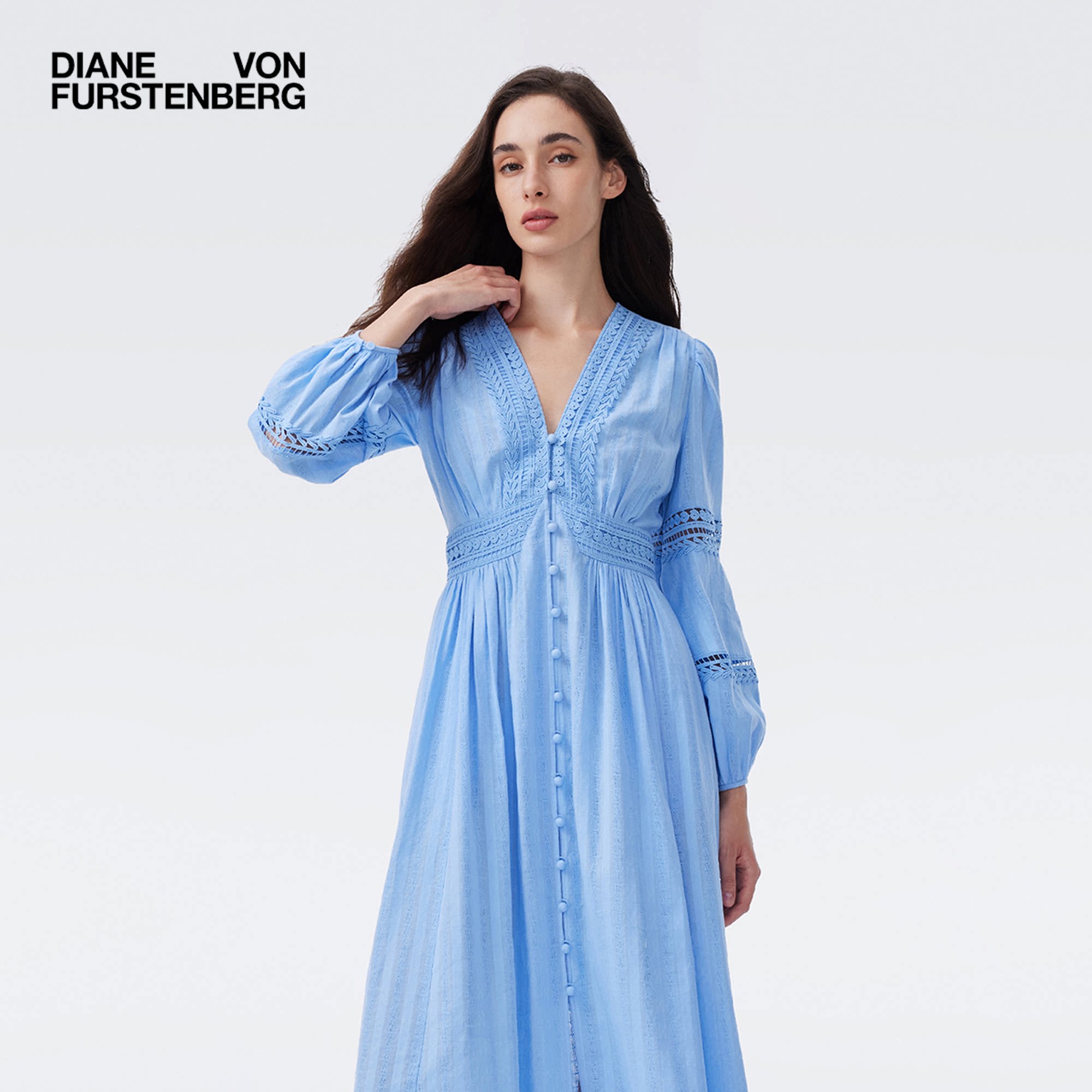 DVF2026春夏新款 V领茶歇裙天空蓝蕾丝拼接多比棉连衣裙DL1U003