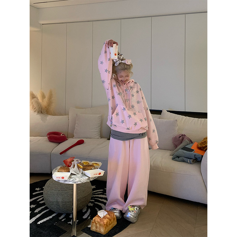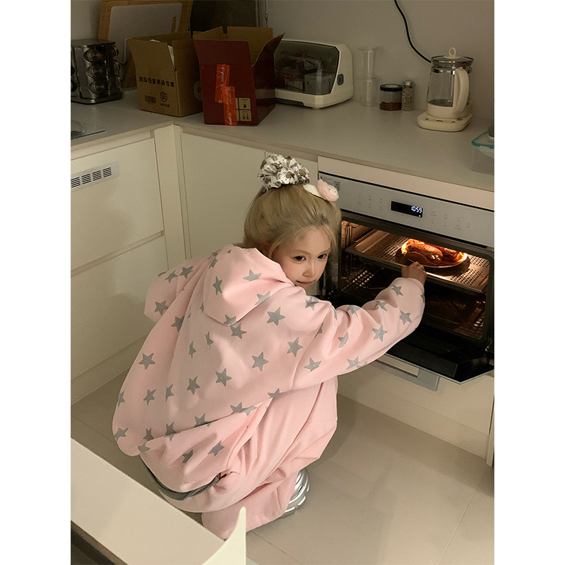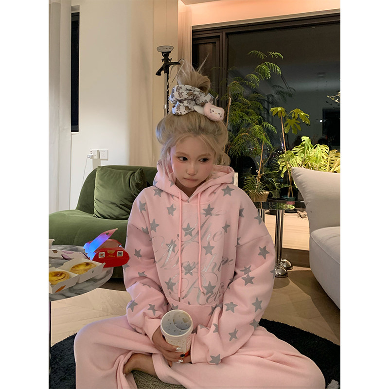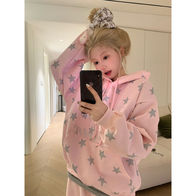 JMJ 设计感星星字母印花连帽卫衣男女宽松休闲慵懒套头外套 美式