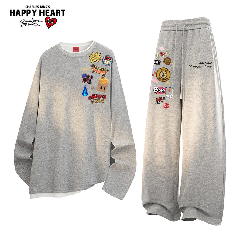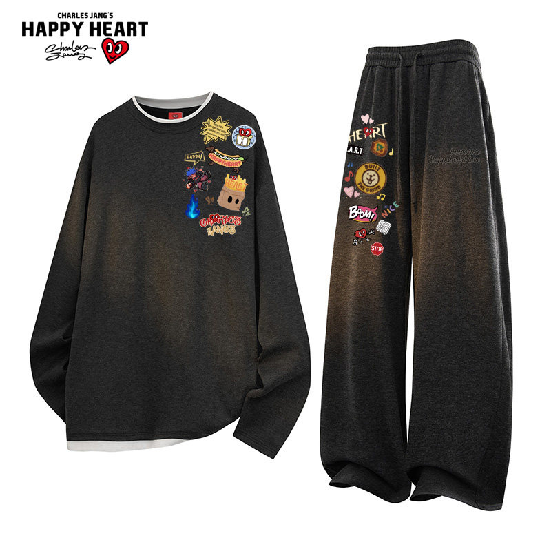 绵羊绒两件装 涂鸦圆领卫衣垂感长裤 男秋冬季 查尔斯桃心休闲套装