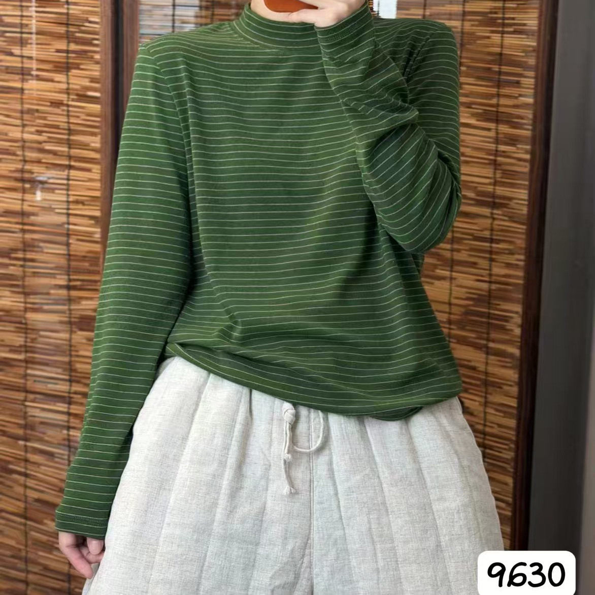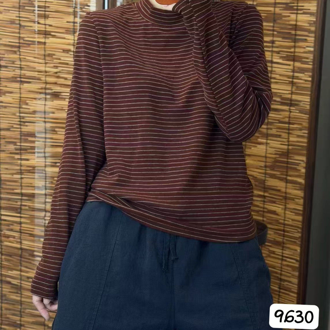 女宽松显瘦百搭长袖 条纹宽松透气休闲打底衫 T恤上衣日常 新款 9630