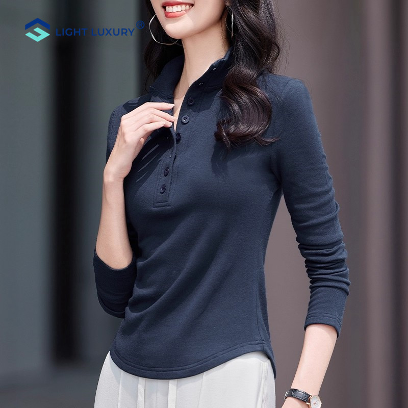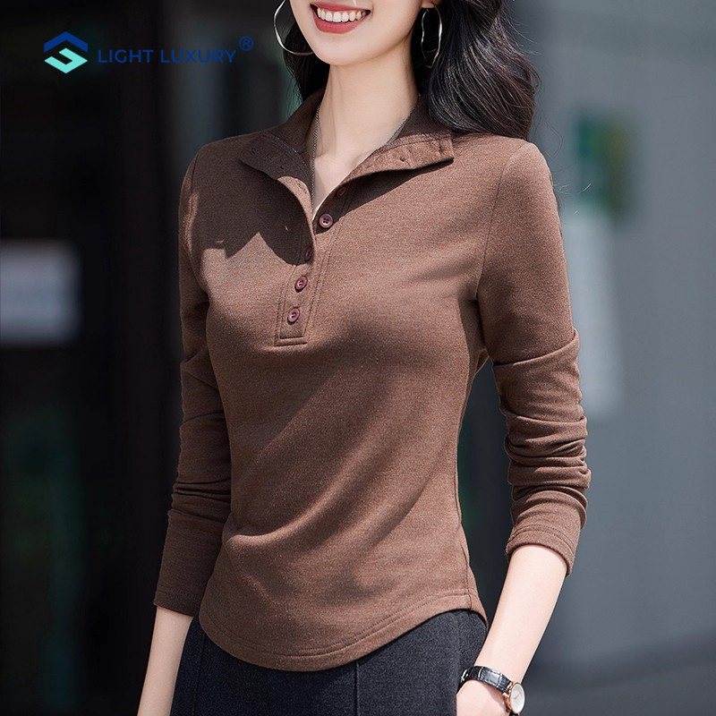 上衣 内搭体恤舒适大码 美拉德棕德绒打底衫 女半高领纽扣拼接修身