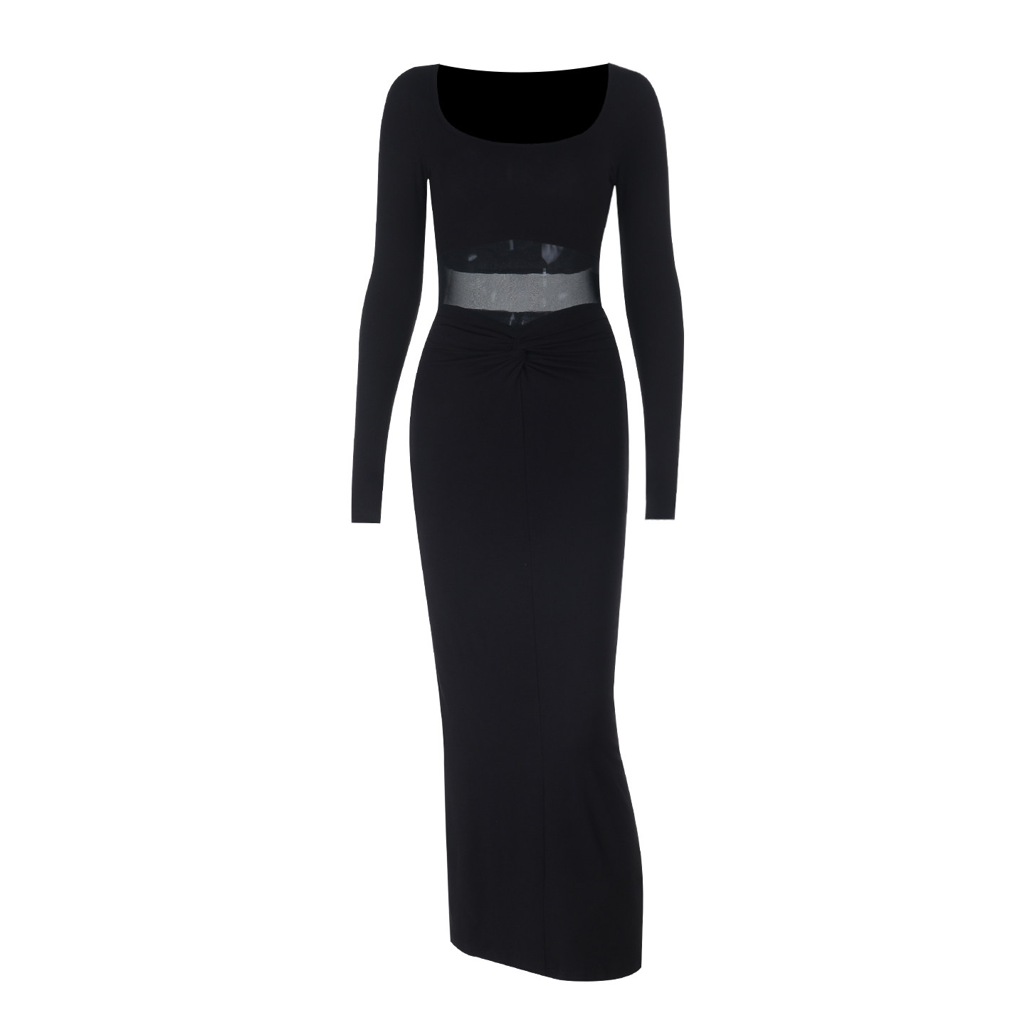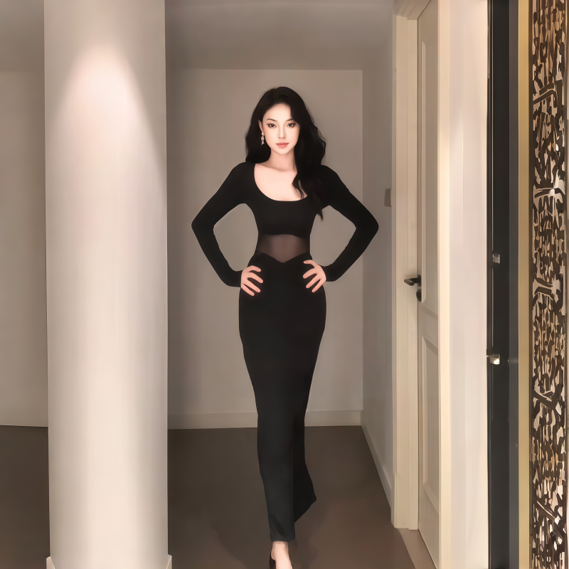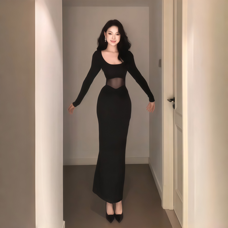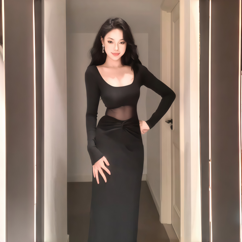 性感气质修身 连衣裙女秋季 针织长裙 黑色U领网纱拼接长袖 instahot