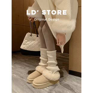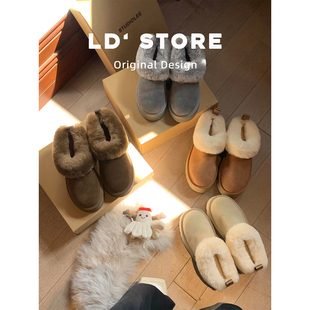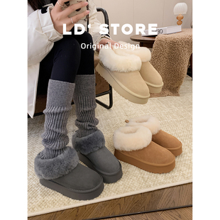 加绒保暖一脚蹬包头棉鞋 冬季 厚底低帮毛毛雪地靴女2025新款 真皮