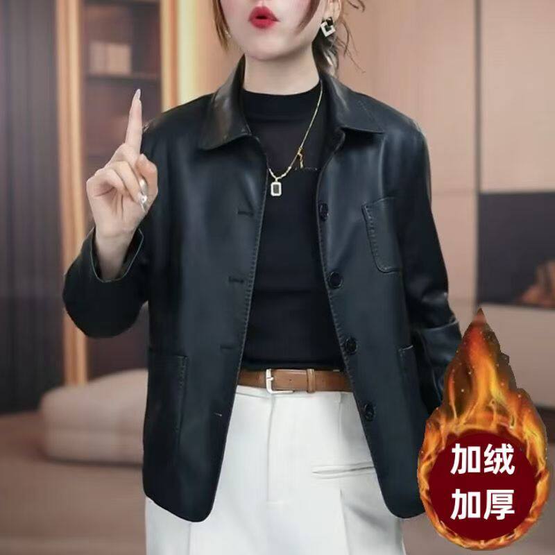 翻领气质百搭皮夹克 宽松休闲时尚 海宁加绒加厚皮衣外套女冬季 新款