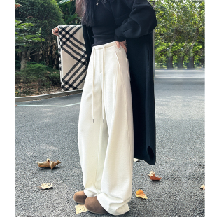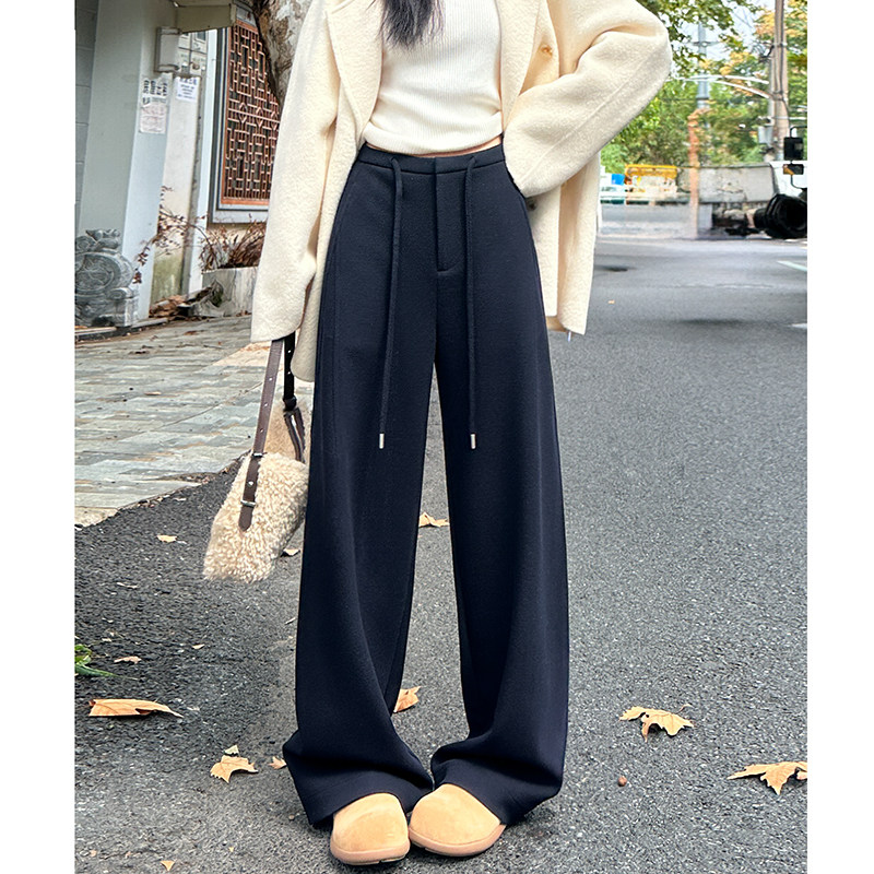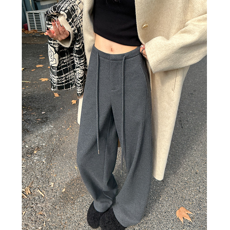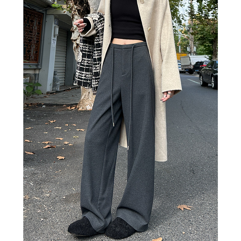 加绒羊绒直筒长裤 高腰拖地糯米裤 子 女秋冬新款 灰色醋酸羊毛阔腿裤