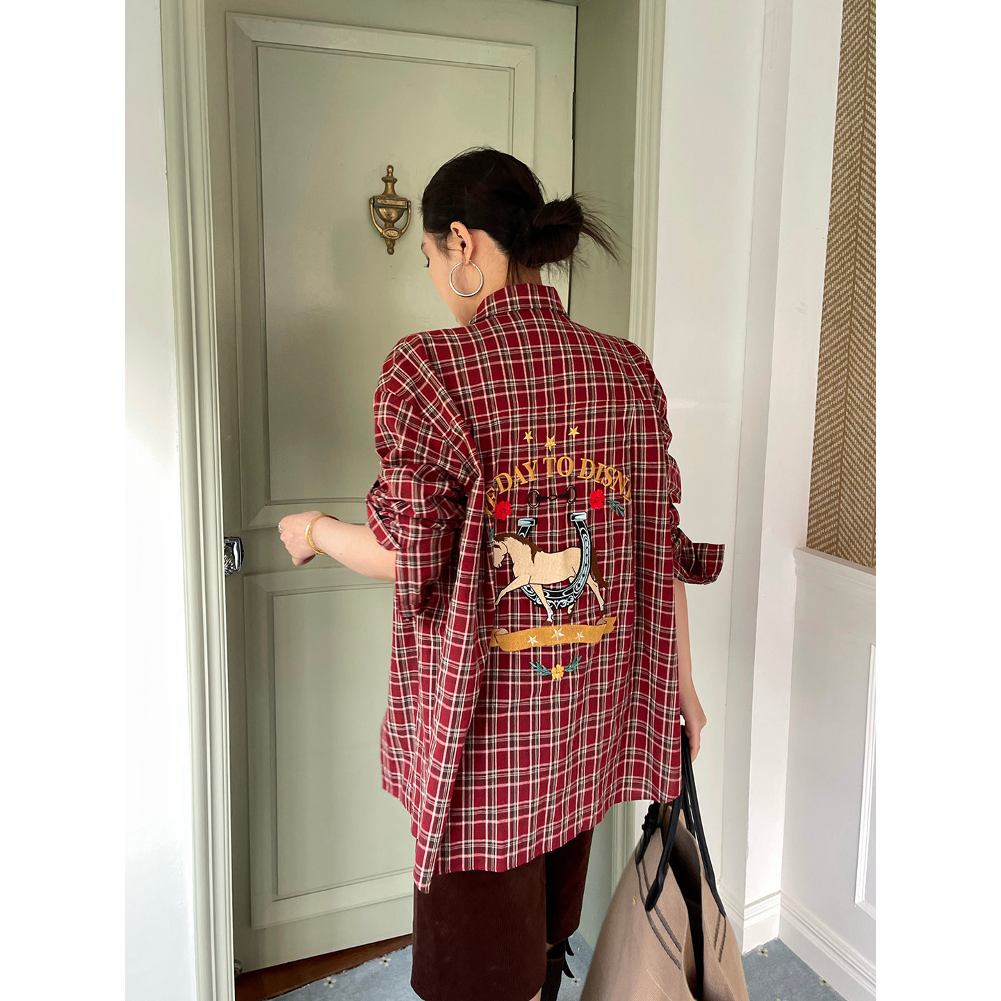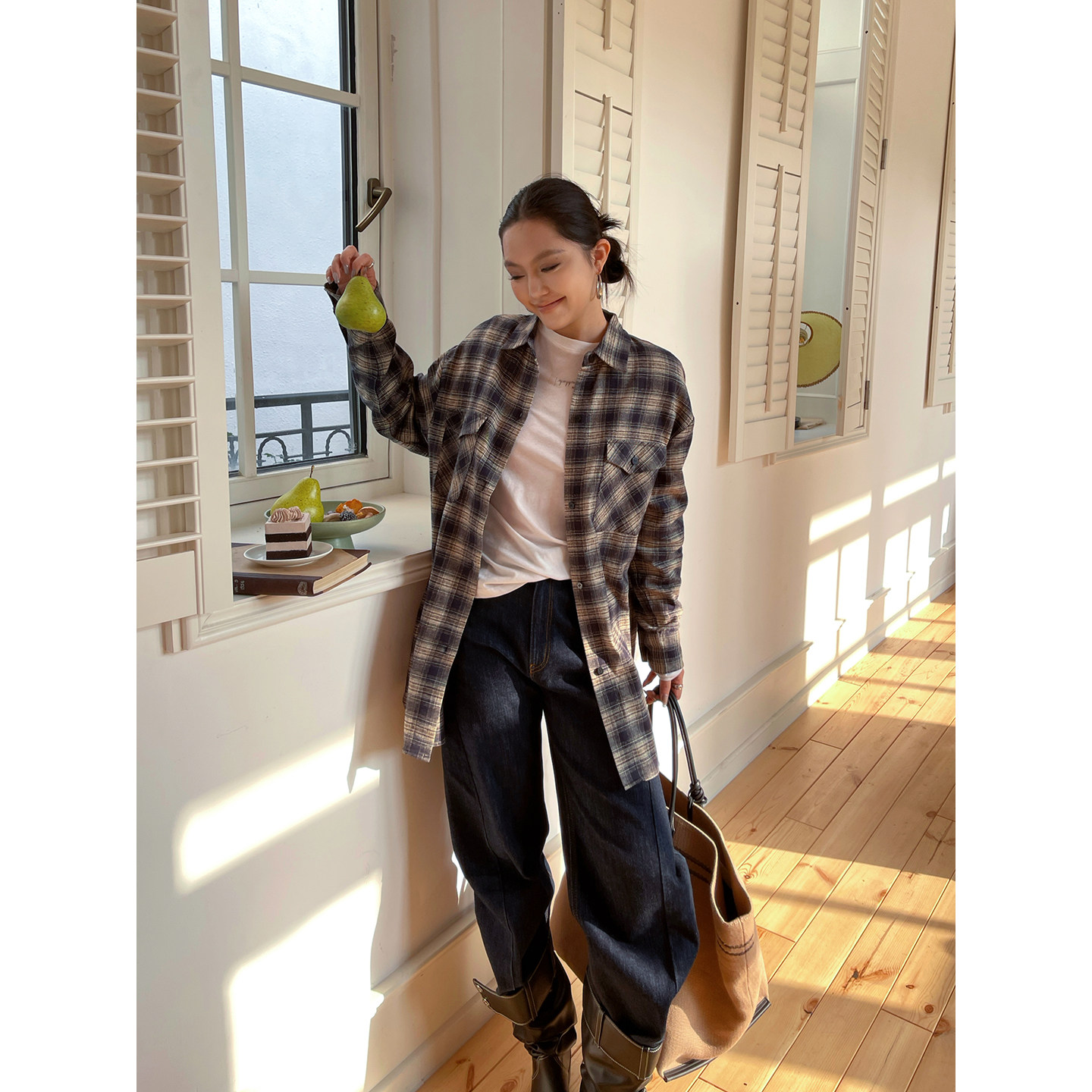 男士 翻领衬衫 FIVECM黑色格子长袖 2025秋冬宽松高级感上衣 5cm