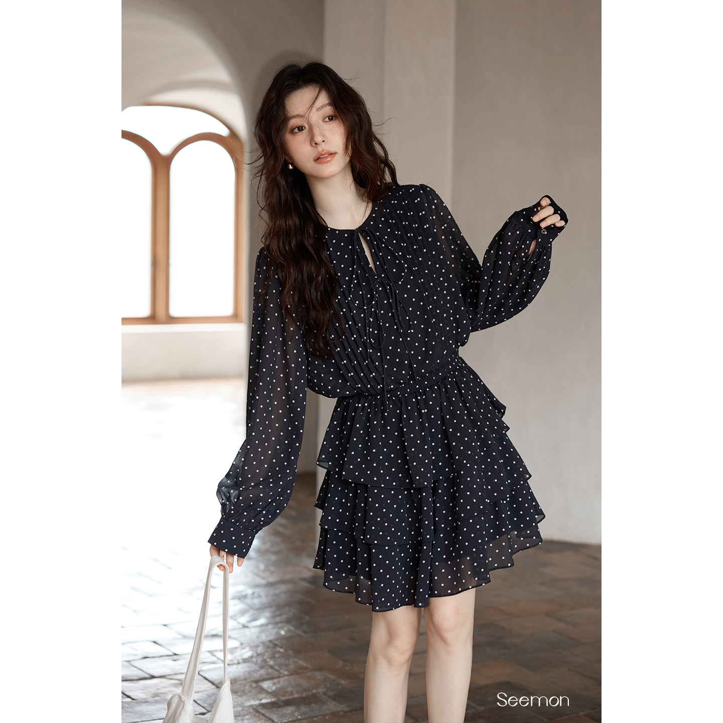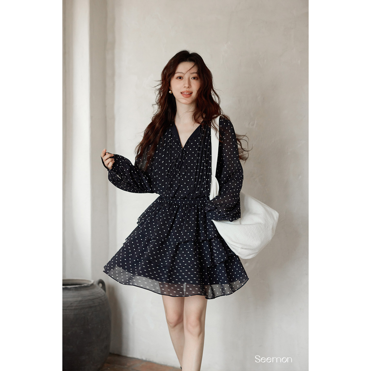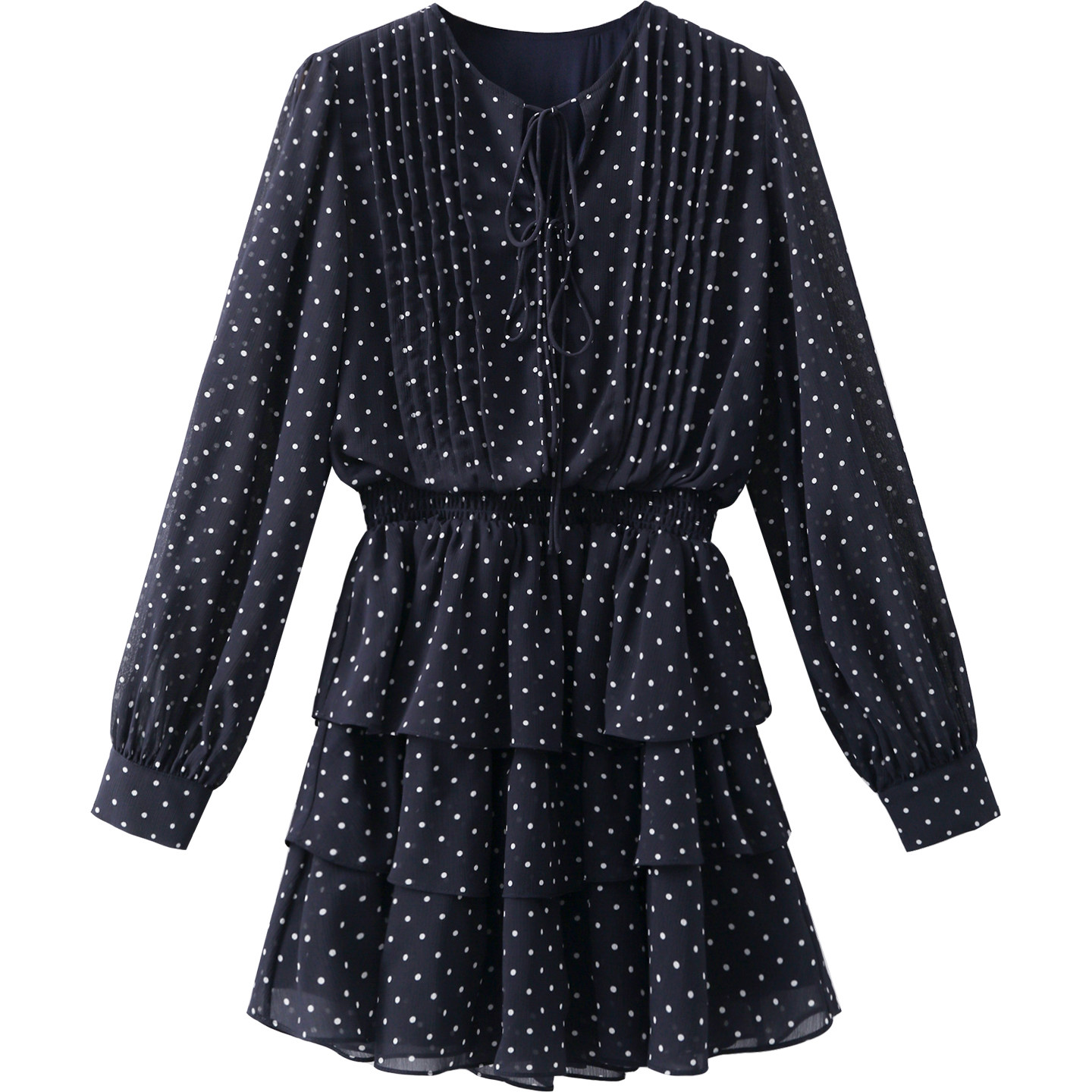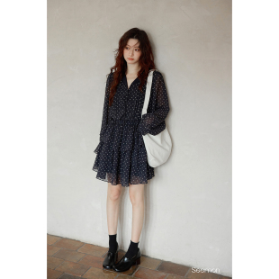 夕蒙2026新款 韩系气质裙子绝美独特漂亮小个子藏青波点连衣裙 春季