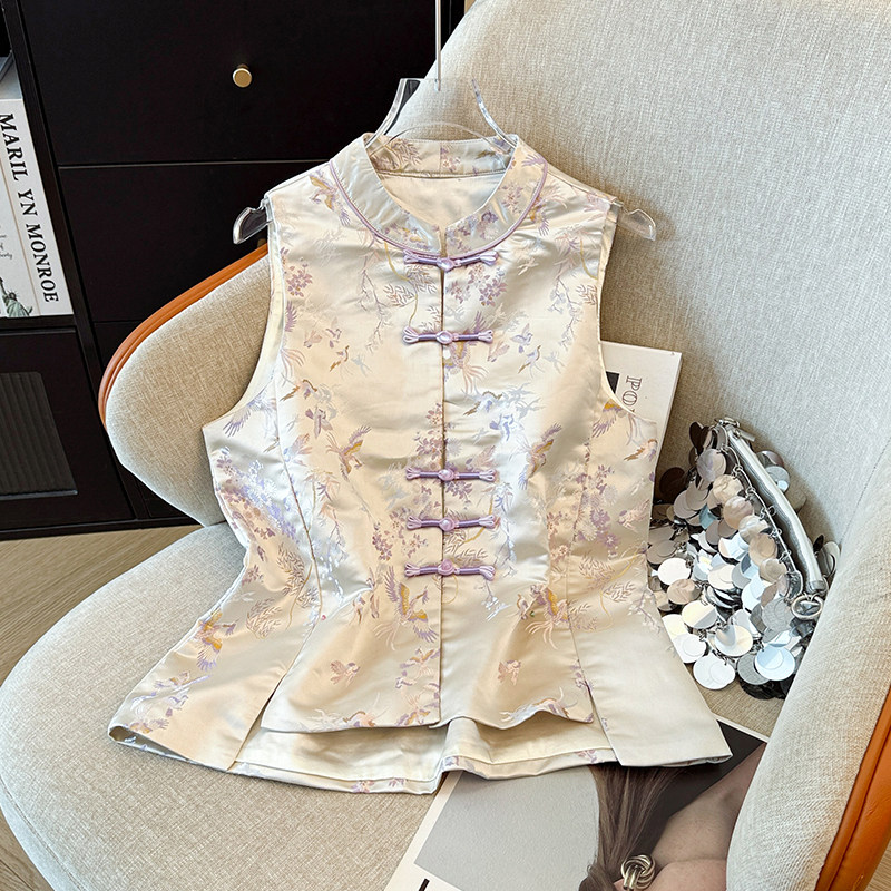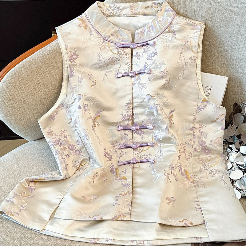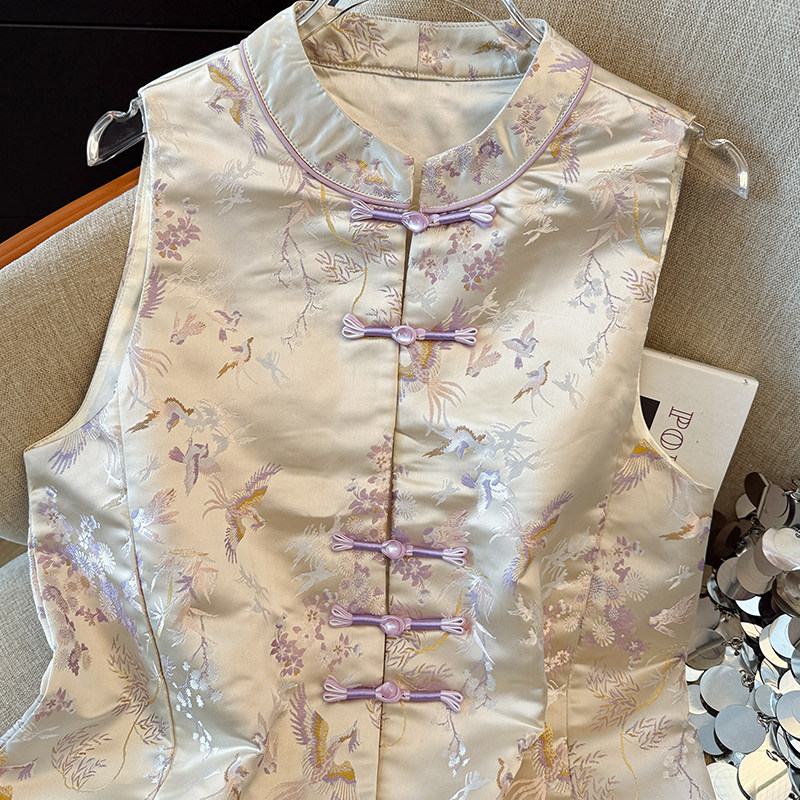 2026新中式 女外套 复古小圆领盘扣国潮民族风缎面织花上衣马甲开衫