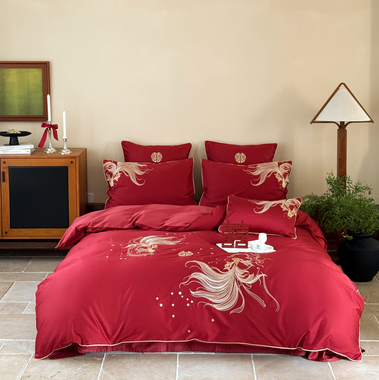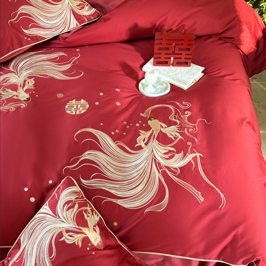 吉庆有鱼婚庆100S长绒棉全棉结婚四件套锦鲤刺绣红色被套陪嫁床品