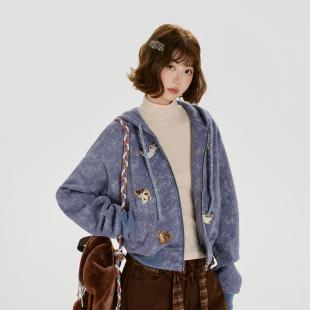 短款 新款 宽松上衣 复古扎染刺绣连帽卫衣外套女秋季 Girlyhalo美式