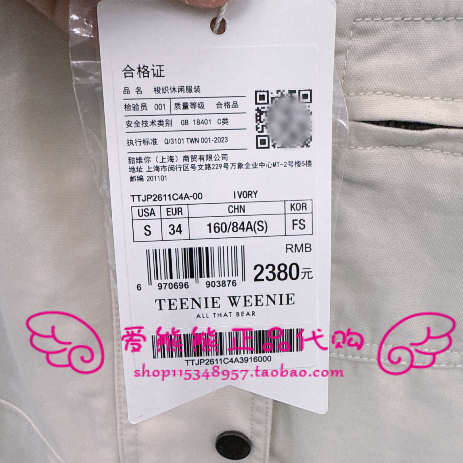 JP2611C4A 当天发TeenieWeenie小熊26年春正品 外套TTJP2611C4A