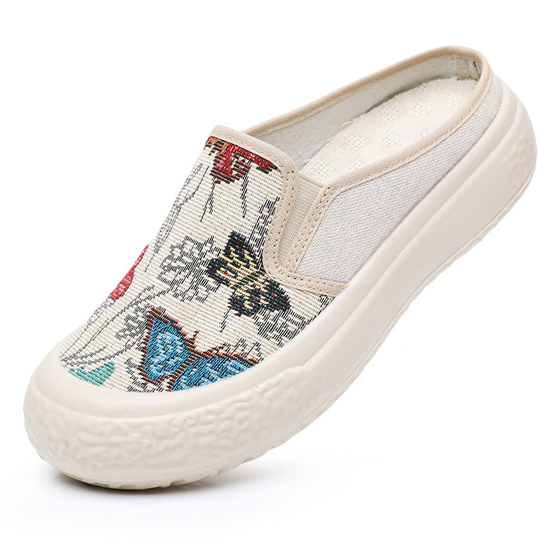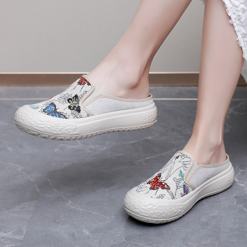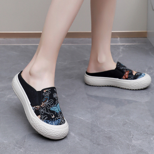 春夏透气百搭一脚蹬懒人厚底女鞋 女2025新款 外穿 帆布鞋 包头半拖鞋