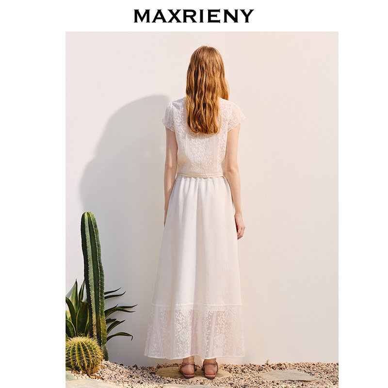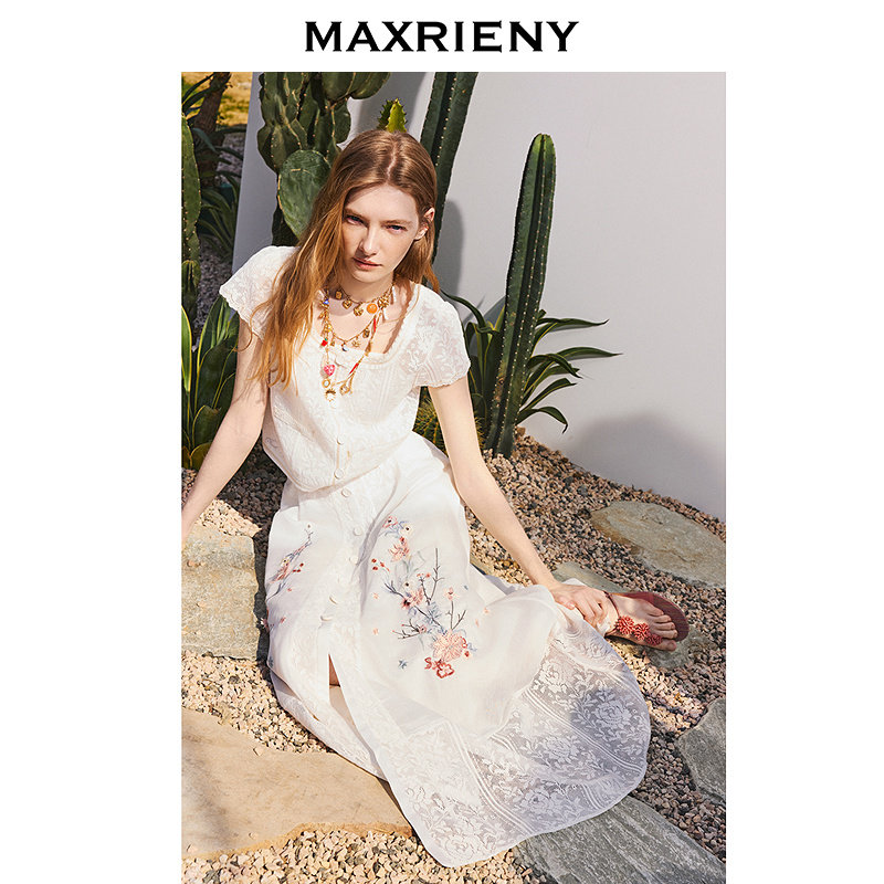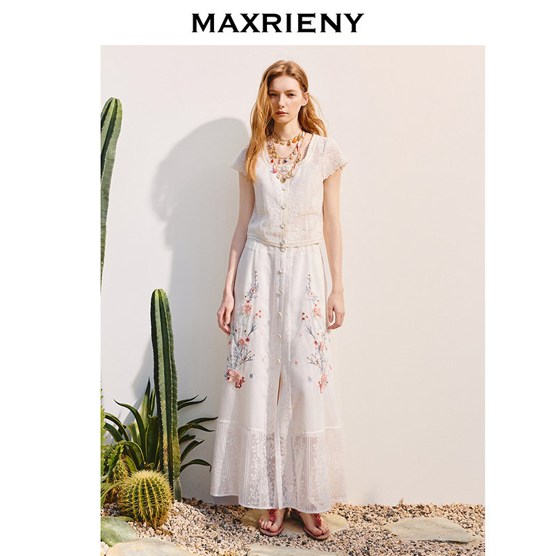 绣花半裙25夏a摆压褶高腰拼接蕾丝裙 MAXRIENY新中式 商场同款